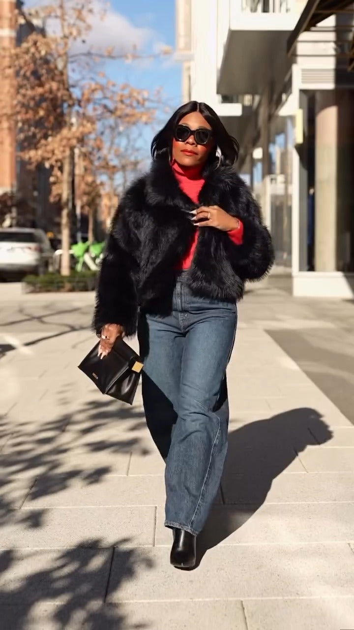 Black faux fur short coat: Soft warm faux fur fabric, cropped loose fit + V-neck design. Ideal for fall-winter daily/casual styling.