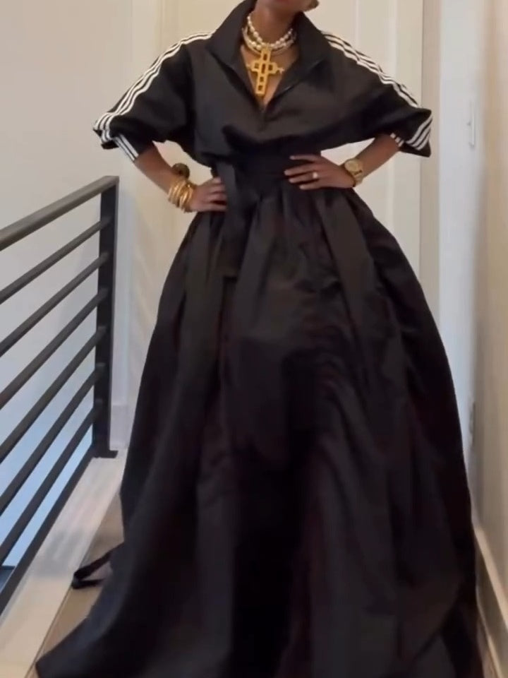 Rooted in authentic sportswear, this maxi dress taps into the ultra-elegant side of fashion. Part track top, part voluminous dress, ruching detail and an extra-long reach create a draped look that's both dazzlingly old world and daringly new. It has a loose, easygoing fit with a stand-up collar. A long belt wraps around the waist and dangles in the front.
