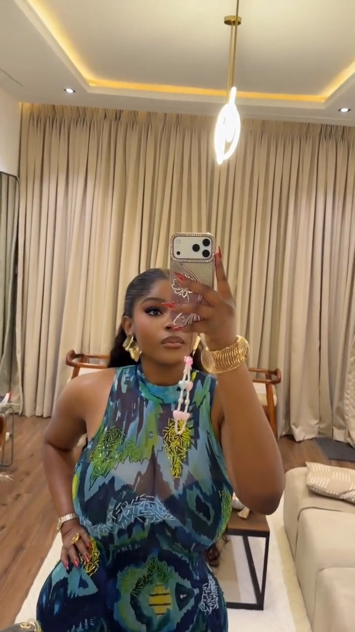 - Design: Sleeveless turtleneck, slim-fitting maxi length, blue-green abstract art print, sheer texture