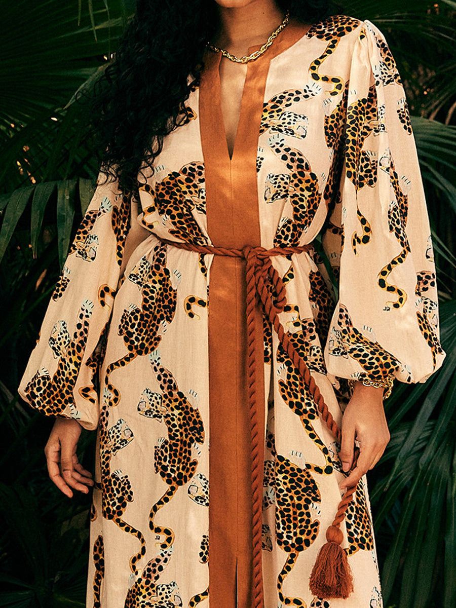- Style: Chic maxi dress featuring a bold leopard print with rich brown accents.