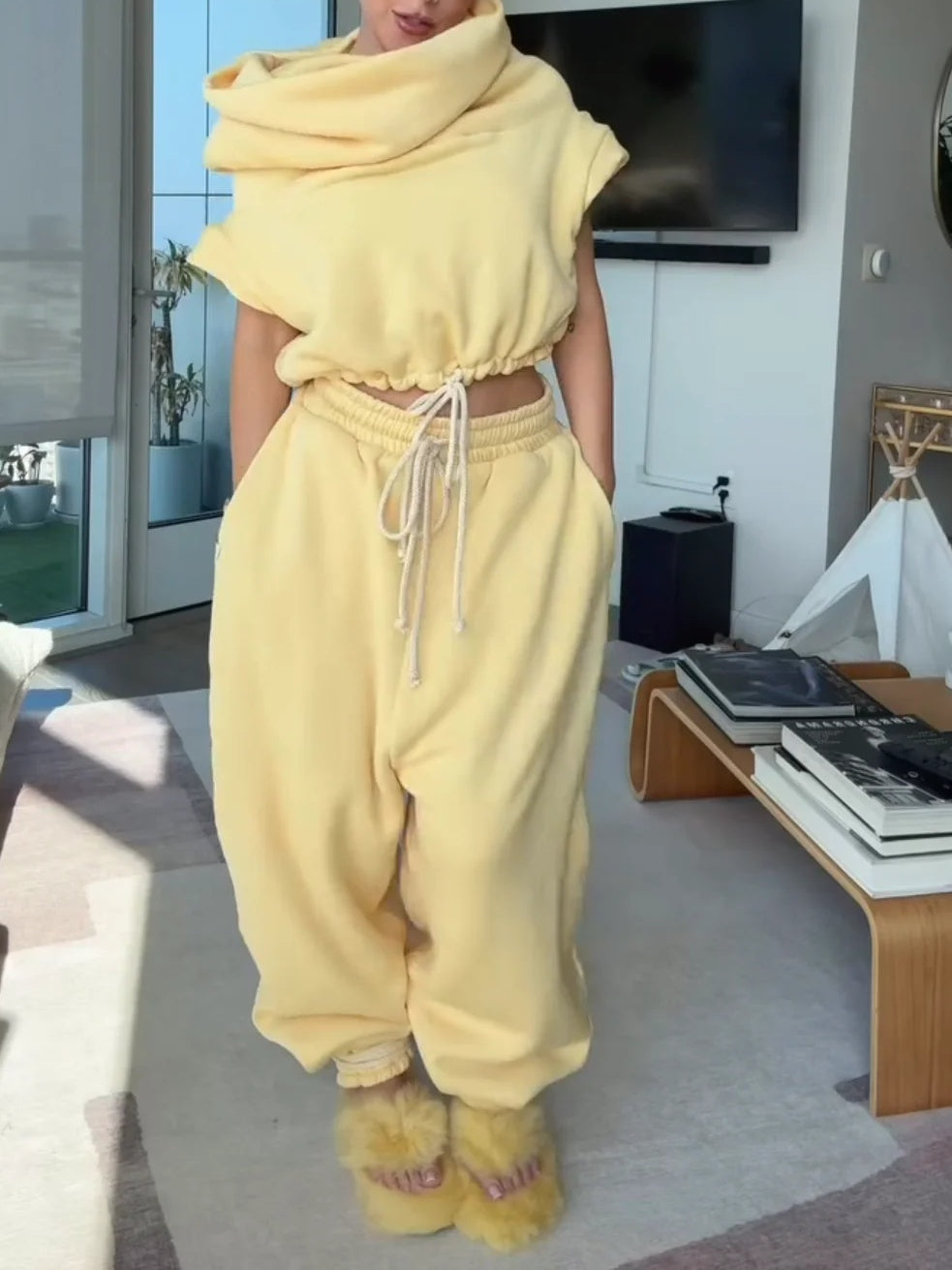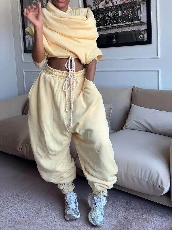 Elasticized, drawstring waistband and ankle cuffs. Cotton drawstrings at ankles and waist.