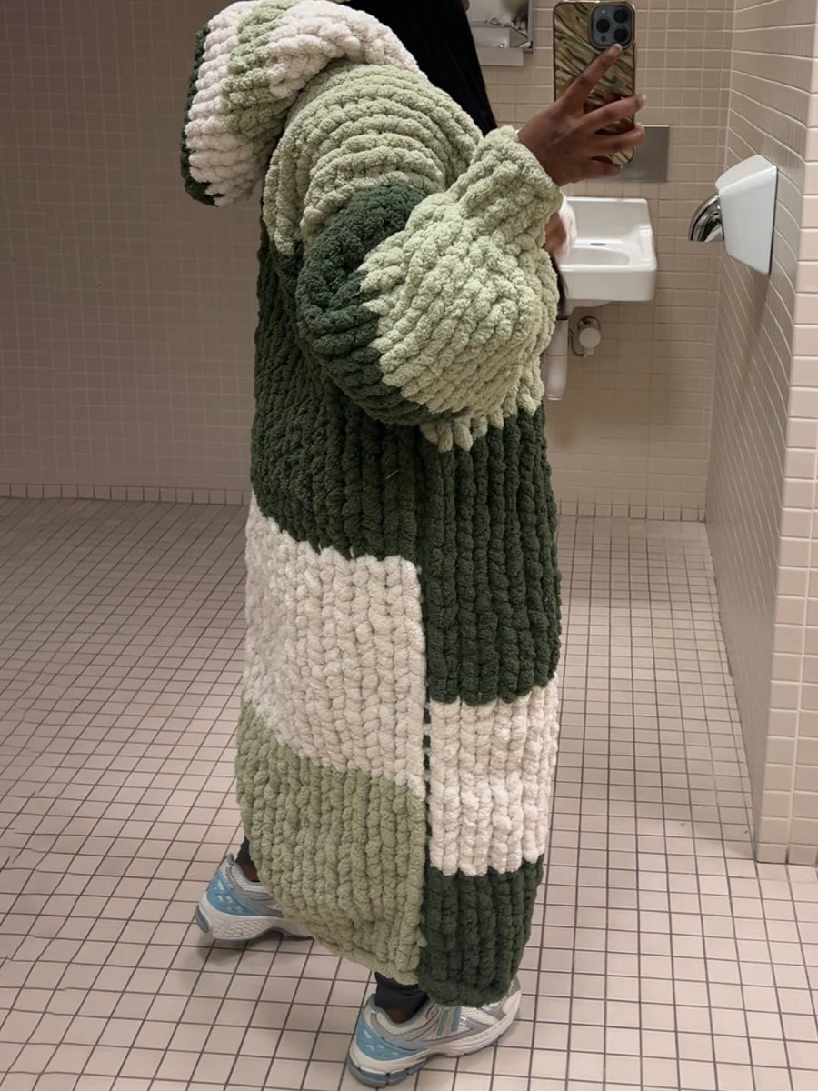 - Design: Features an oversized longline silhouette with a hood, crafted from ultra-chunky knit fabric in shades of green and cream. The relaxed fit and natural hues create a fashion-forward, loungewear-chic look with a touch of outdoor inspiration.