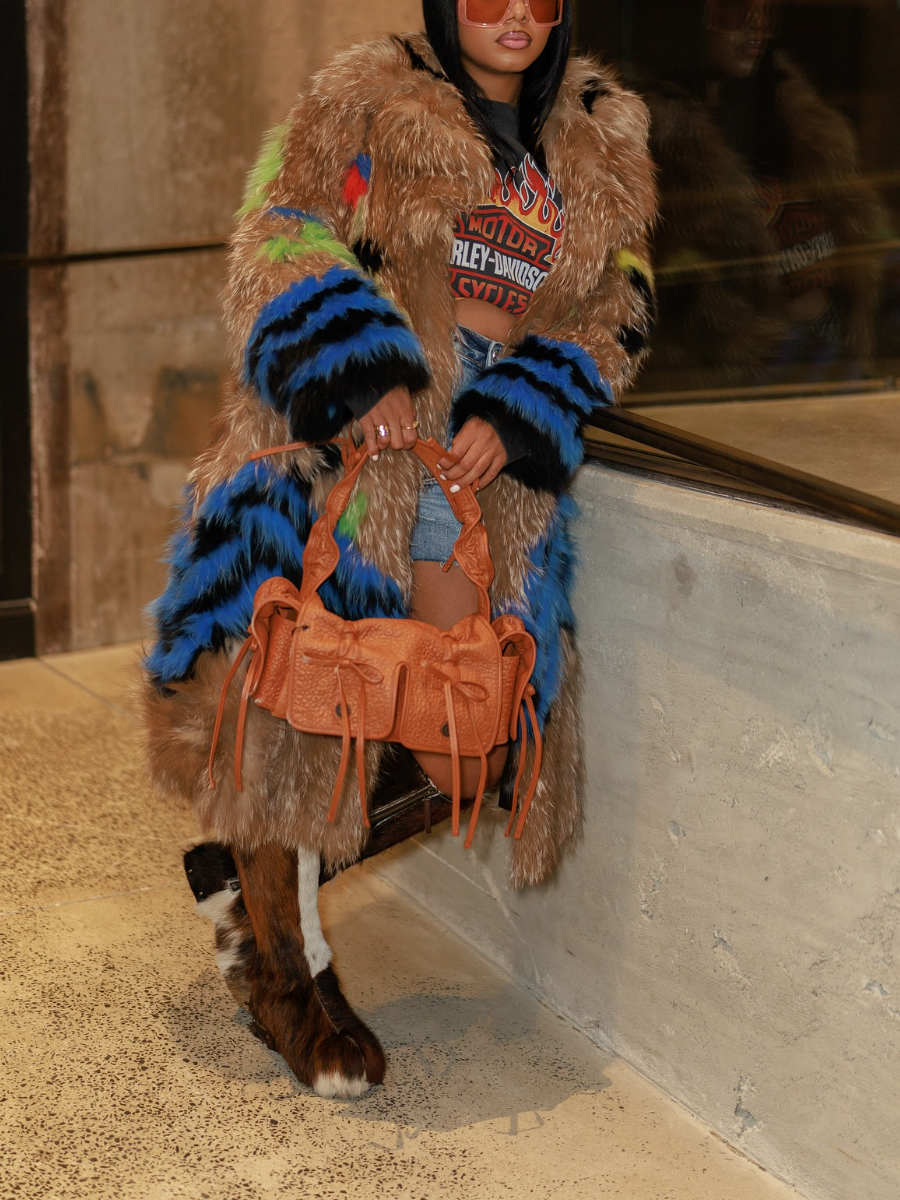 Bold patchwork faux fur long coat: soft, warm, oversized for layering. Striking multi-color design fits winter fashion/street outings.
