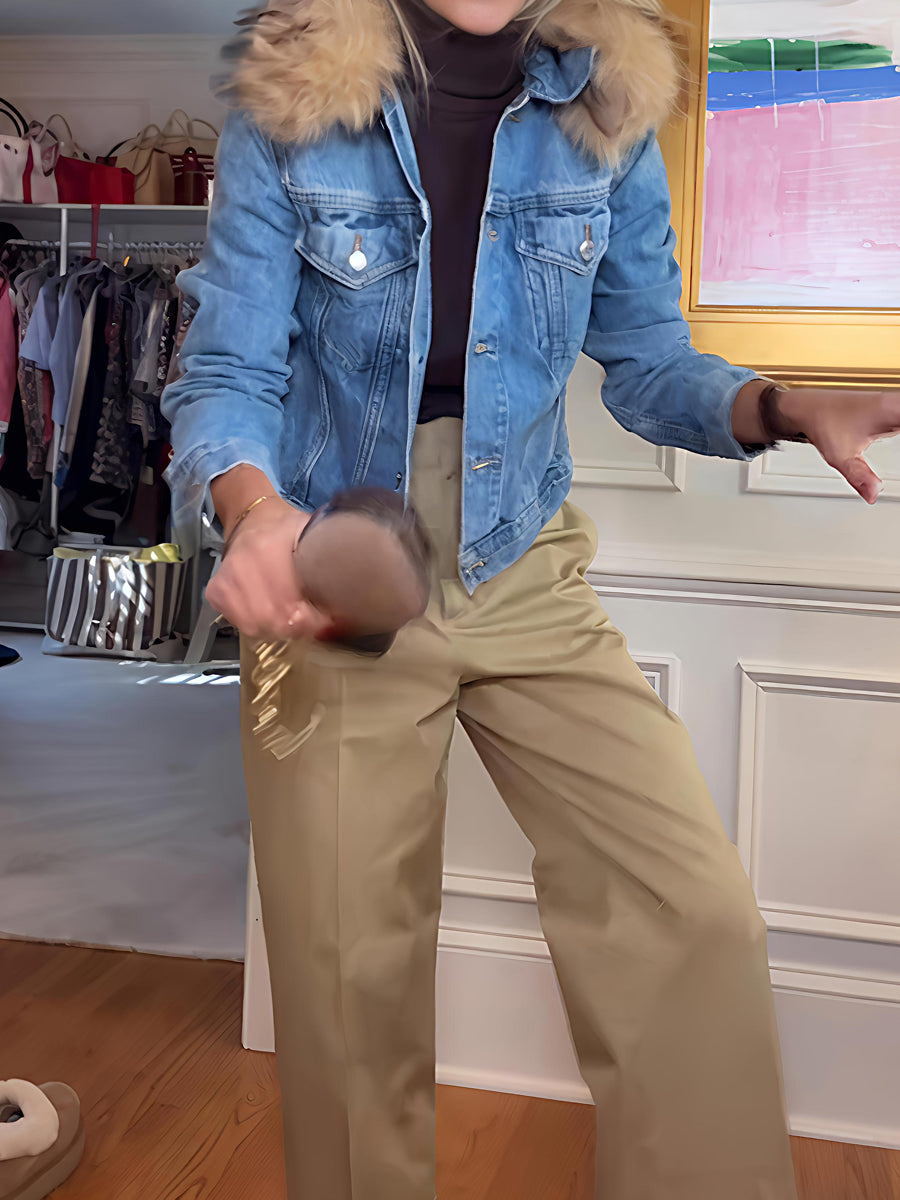 - Style:Denim jacket with faux fur collar, blending casual denim vibes and cozy luxury.