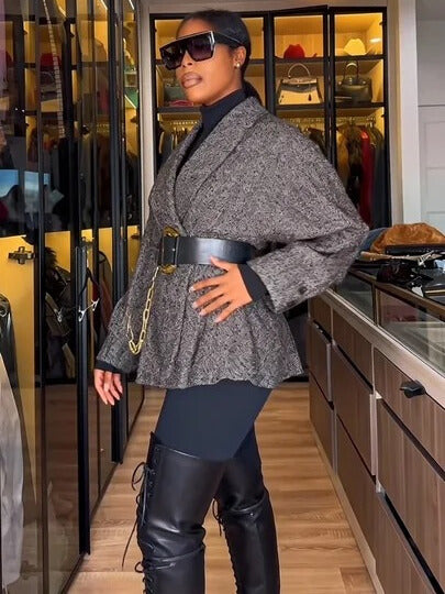 - Fit: Oversized silhouette with cinched waist (flattens figure)