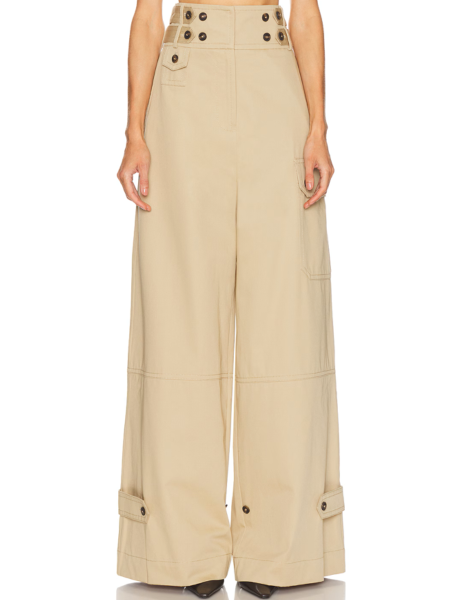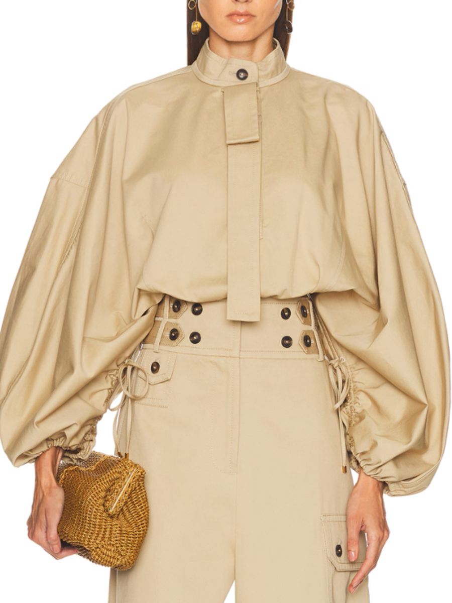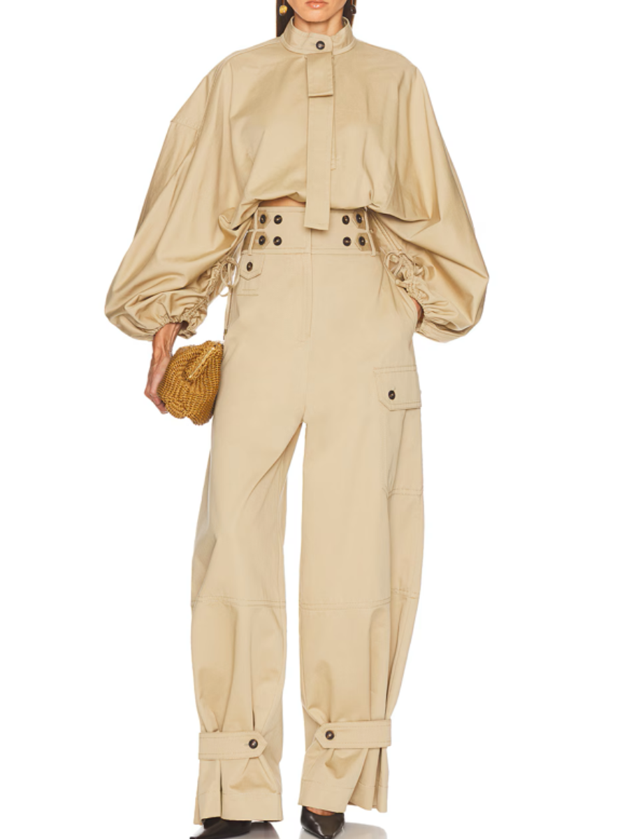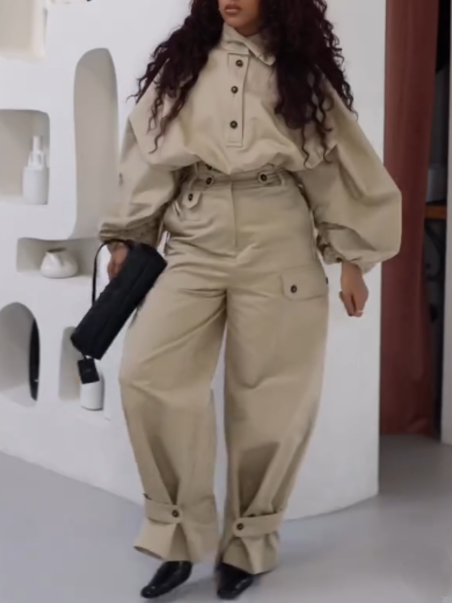 - Design: Oversized puff-sleeve button-front top, wide-leg pants with buckle cuffs, matching waist belt (for waist cinching)