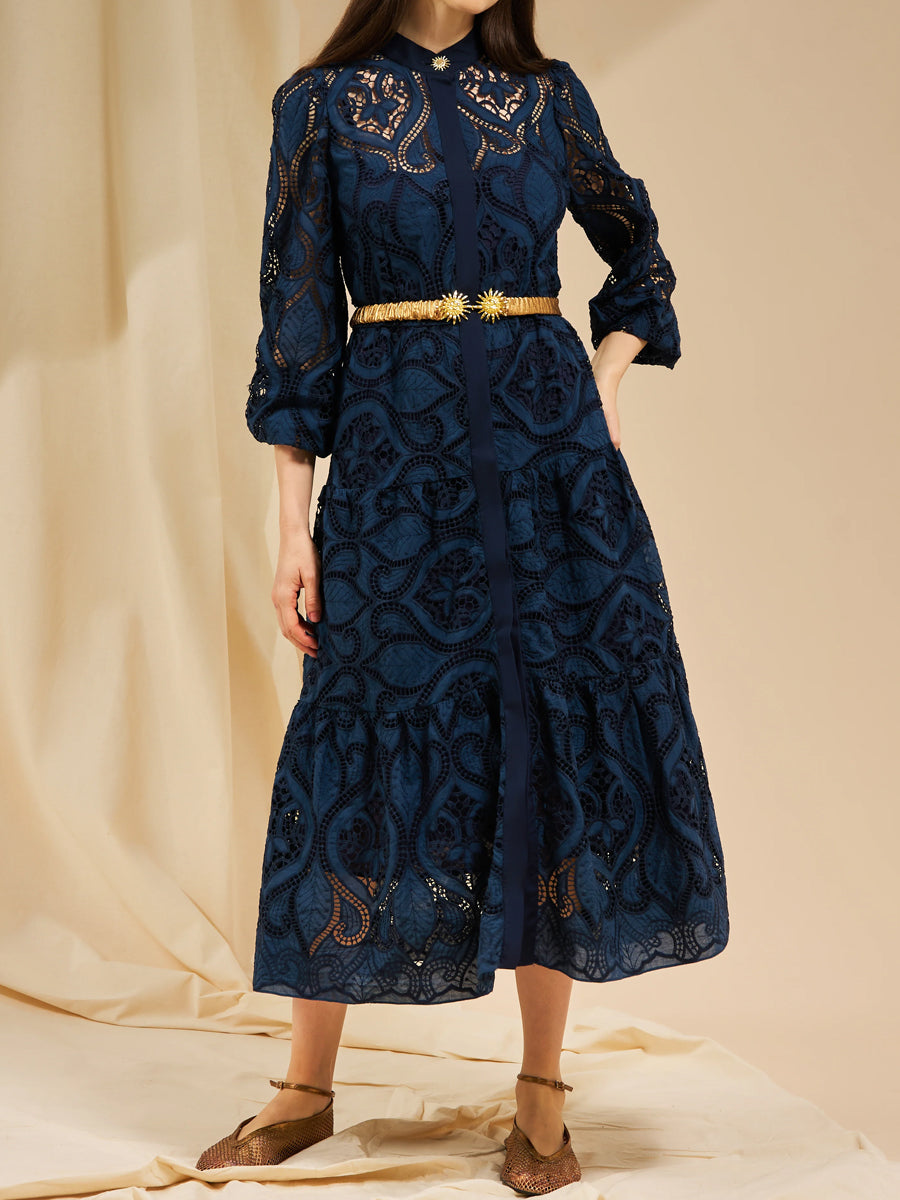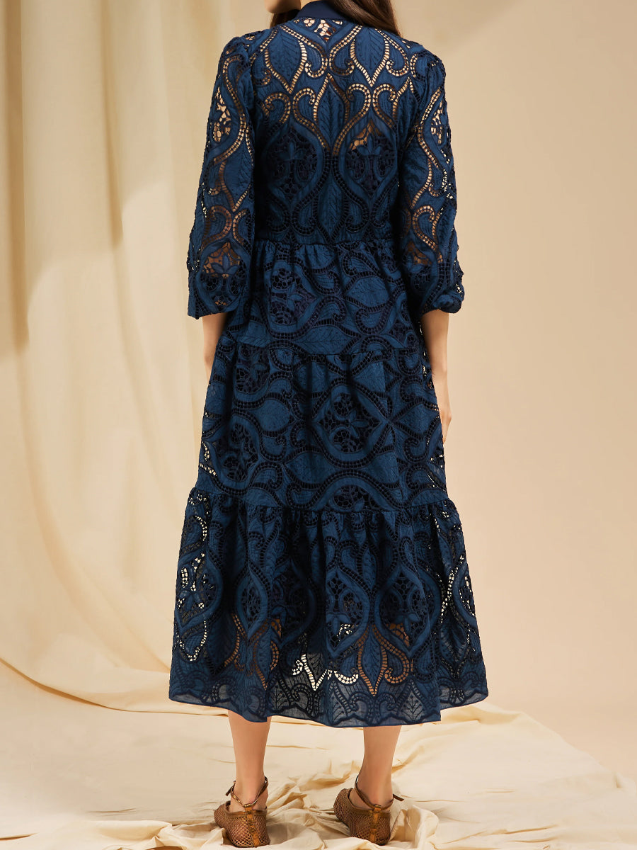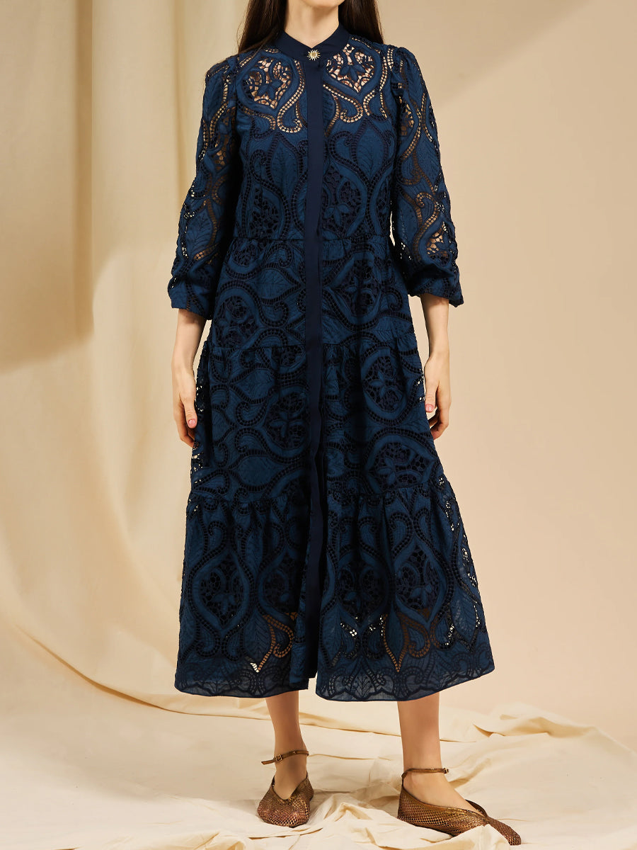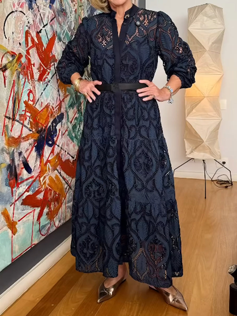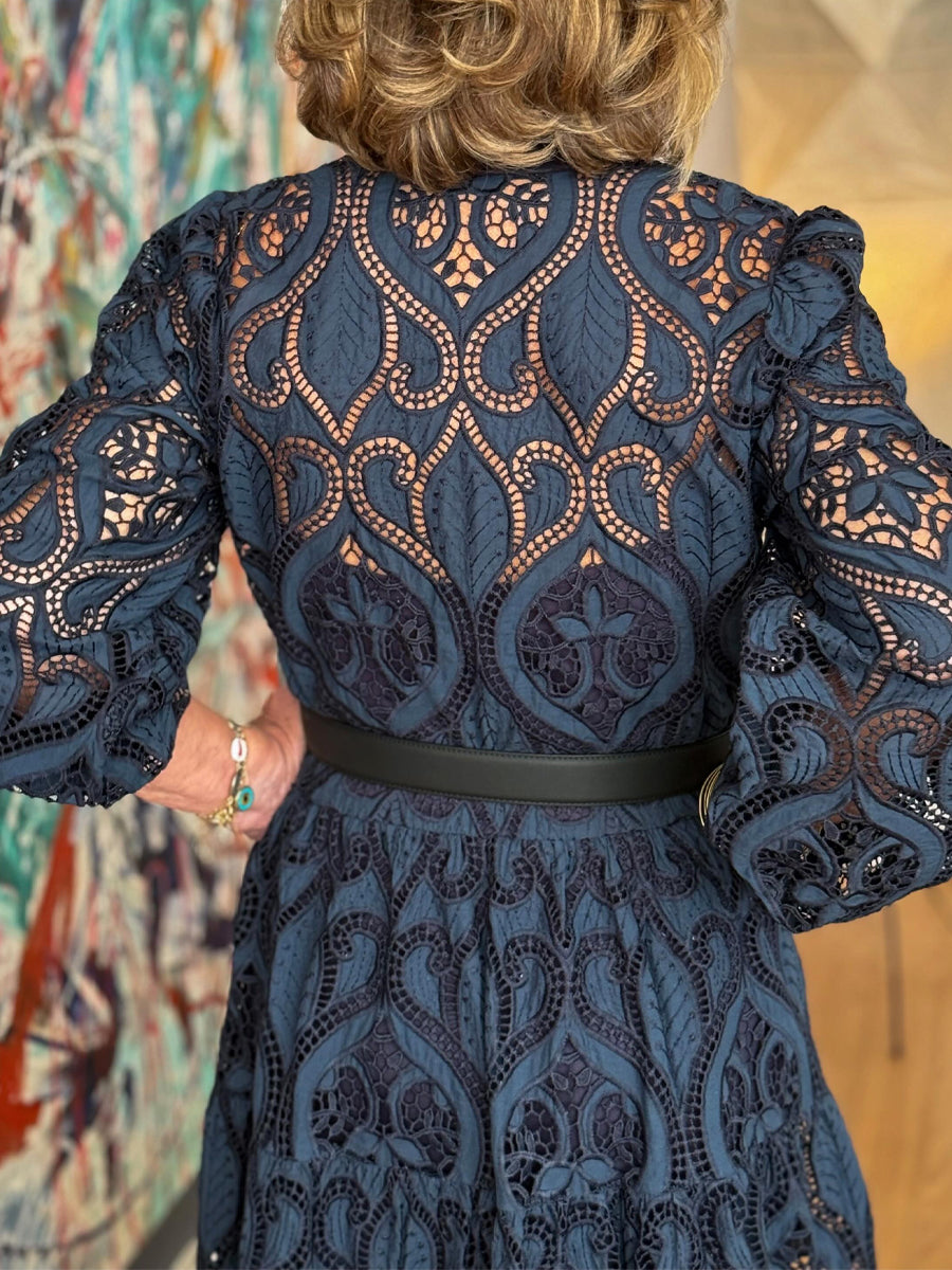 - Style: Elegant navy blue long - sleeve midi dress with intricate lace detailing.