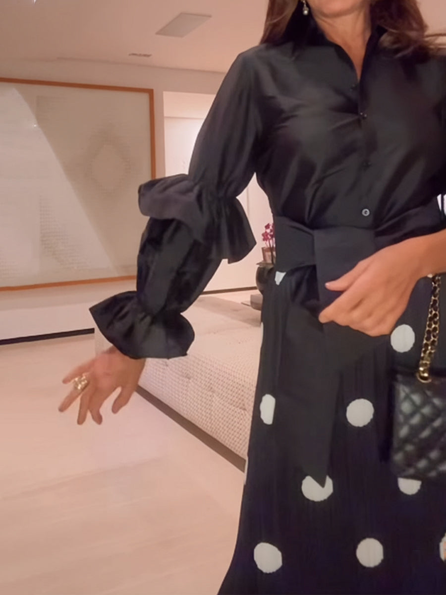 - Design: Features a collared shirt top with dramatic ruffled cuffs, a self - tie belt at the waist to accentuate the figure, and a flowing polka dot skirt with a flared hem for added movement.
