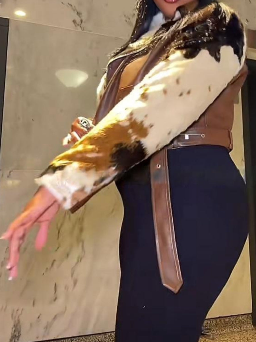 This cropped moto jacket blends edgy style with cozy texture: the smooth brown faux leather delivers a classic, sleek moto edge, while the cow-print faux fur trim (collar & sleeves) adds a playful, warm twist. The adjustable belted waist lets you cinch the silhouette for a tailored fit, and the cropped length pairs perfectly with high-waisted bottoms. It’s ideal for transitional season daily wear, street-style looks, or casual gatherings that call for a bold, textured outfit.