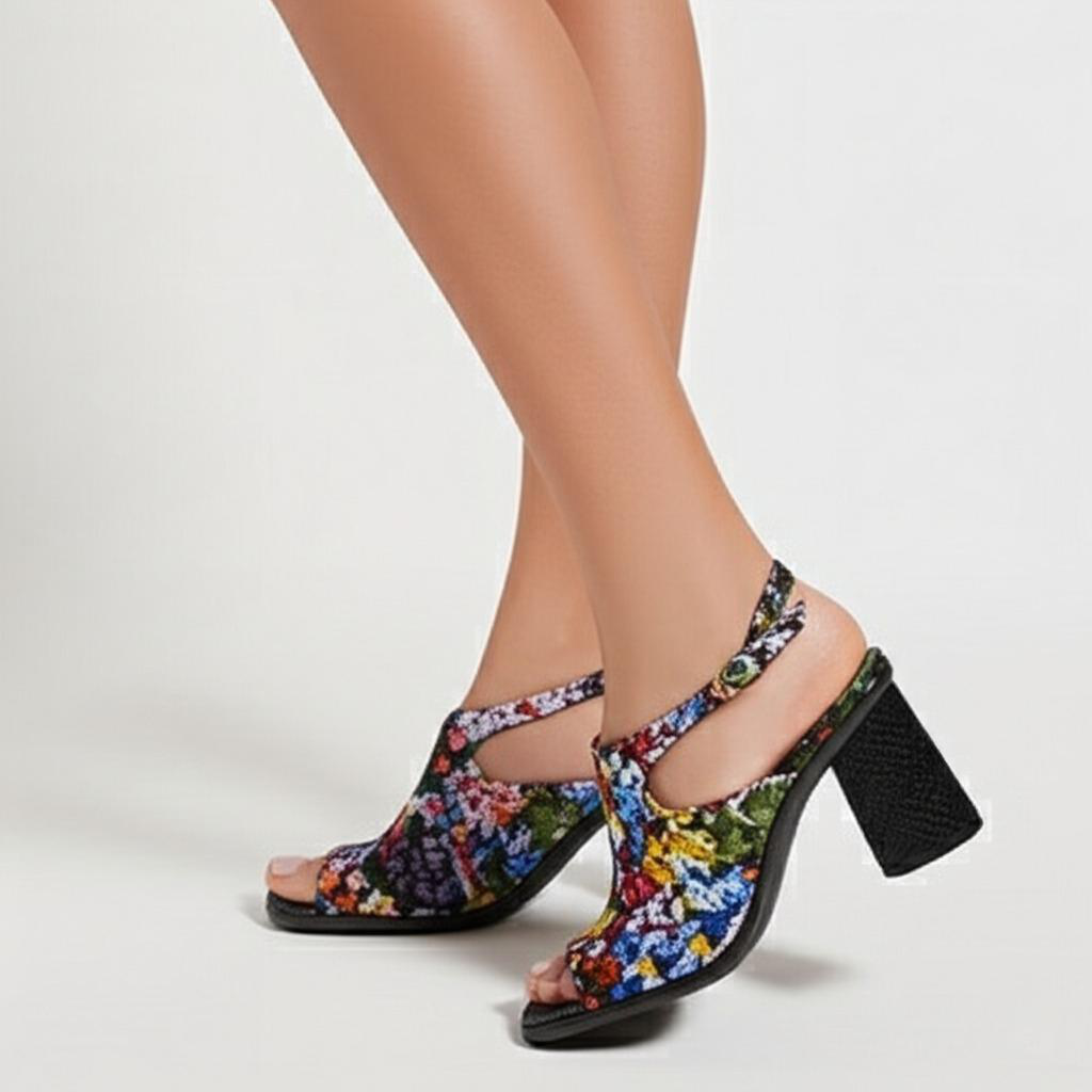 - Style:Open - toe sandals with block heel and ankle strap, adorned with a floral print.