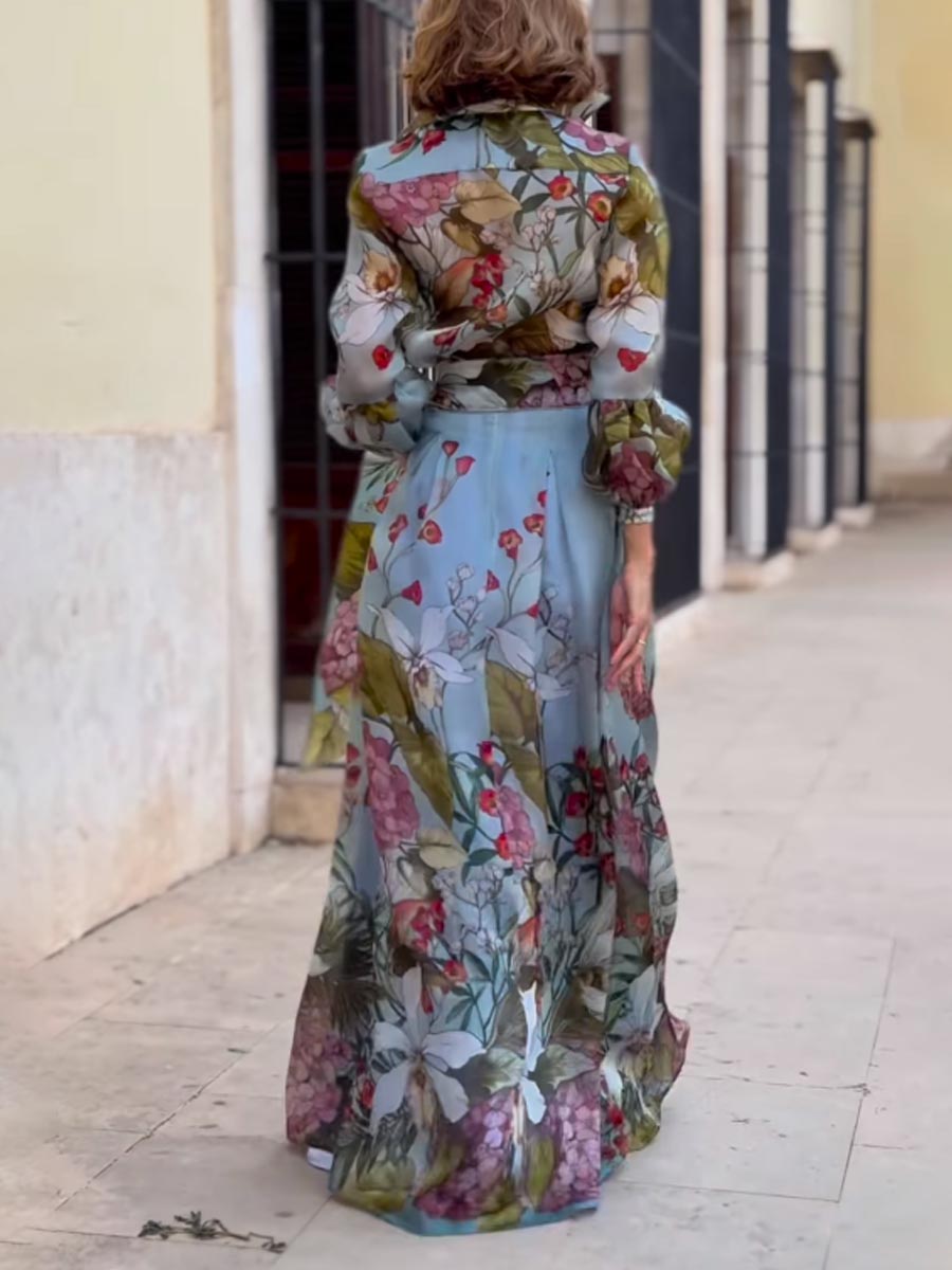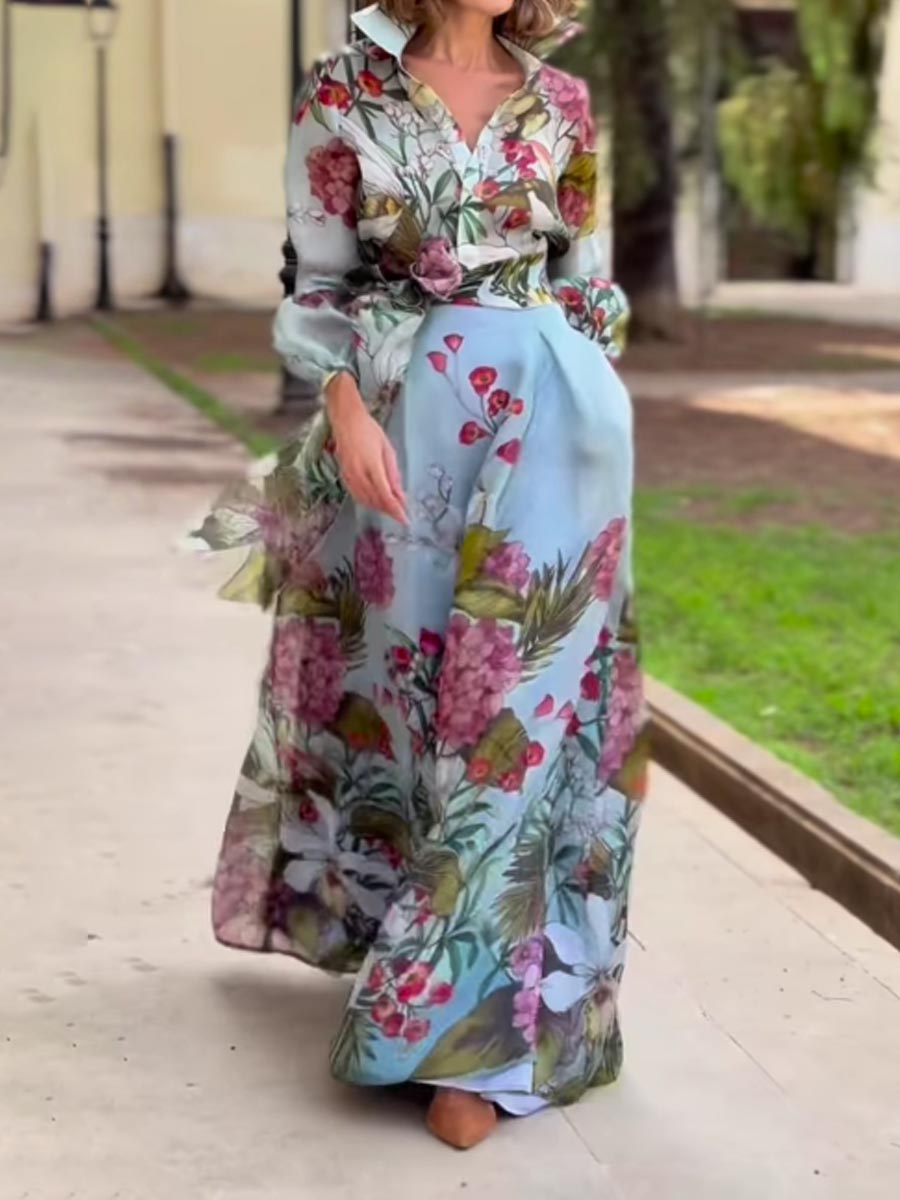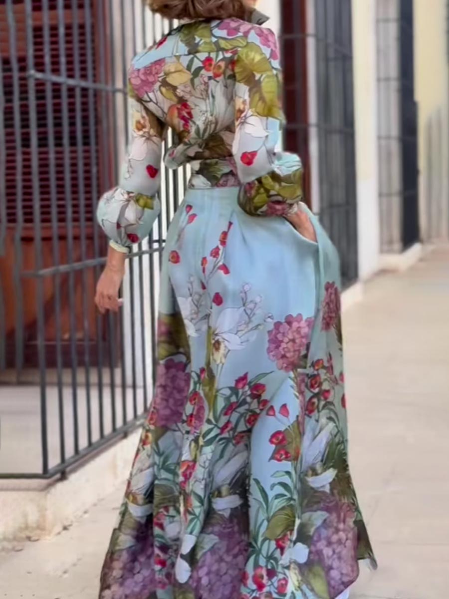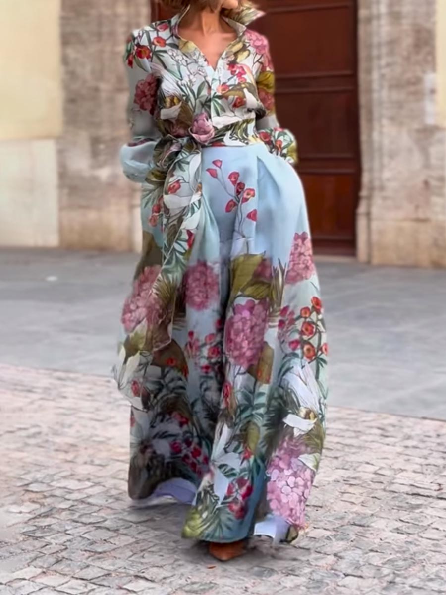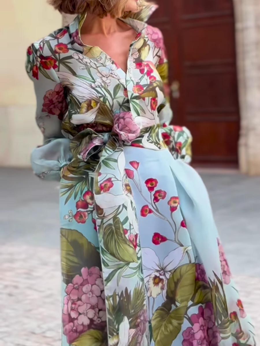 Floral Ptint Long Sleeve Lace Up Two Pieces Dress