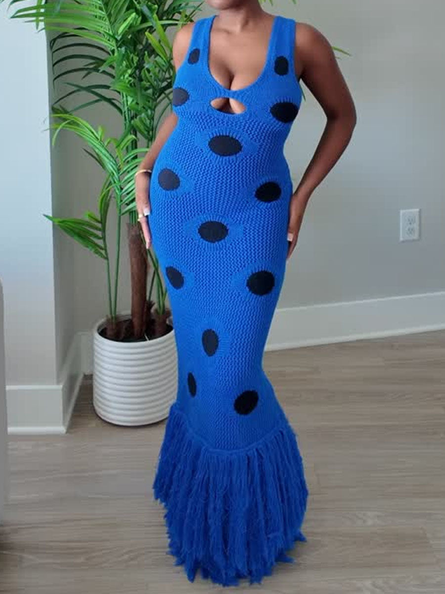 - Design: Features a striking blue knit fabric with large black polka dots, a cut - out detail on the bodice, and a mermaid skirt with fringe. The eye - catching design is full of layers.