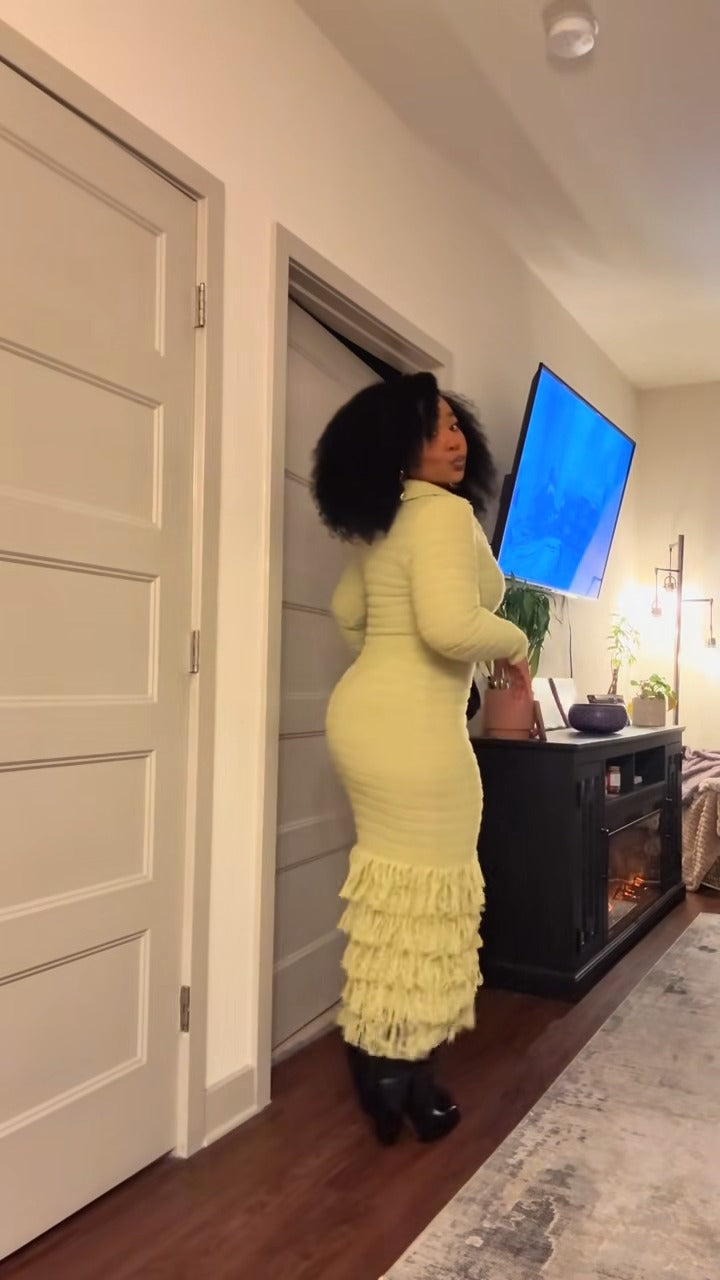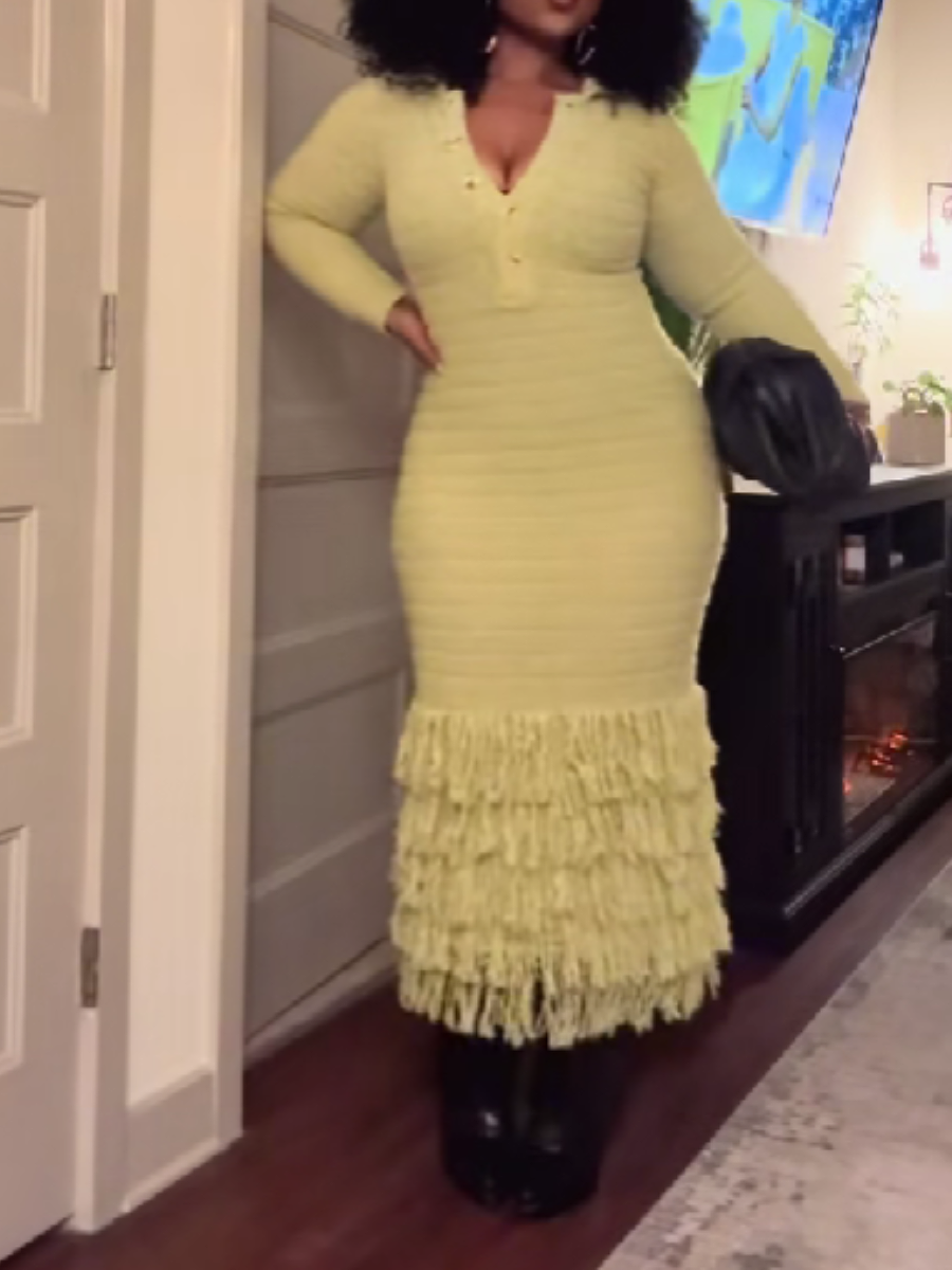 - Design: Deep V-neckline, button detail at front, long sleeves, bodycon silhouette, fringe-trimmed midi hem, solid pale yellow color