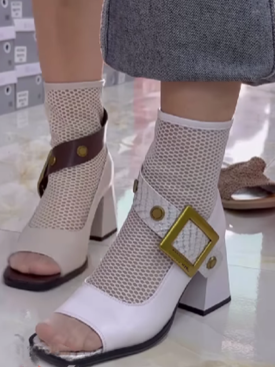 - Style:Heeled sandals with mesh straps and buckle accents. Combines edgy and chic elements.
