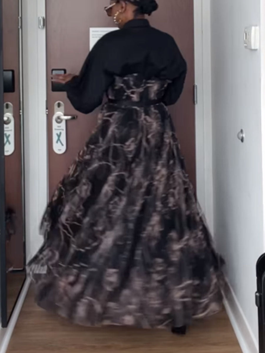 - Design: Layered tulle fabric for volume, bold print, and a structured top with exaggerated sleeves for a statement look.