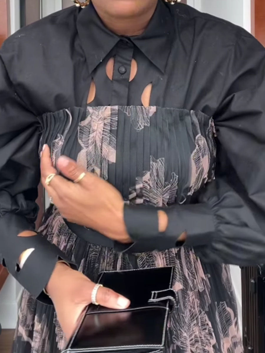 - Style: Dramatic black tulle midi dress with an artistic floral - like print.