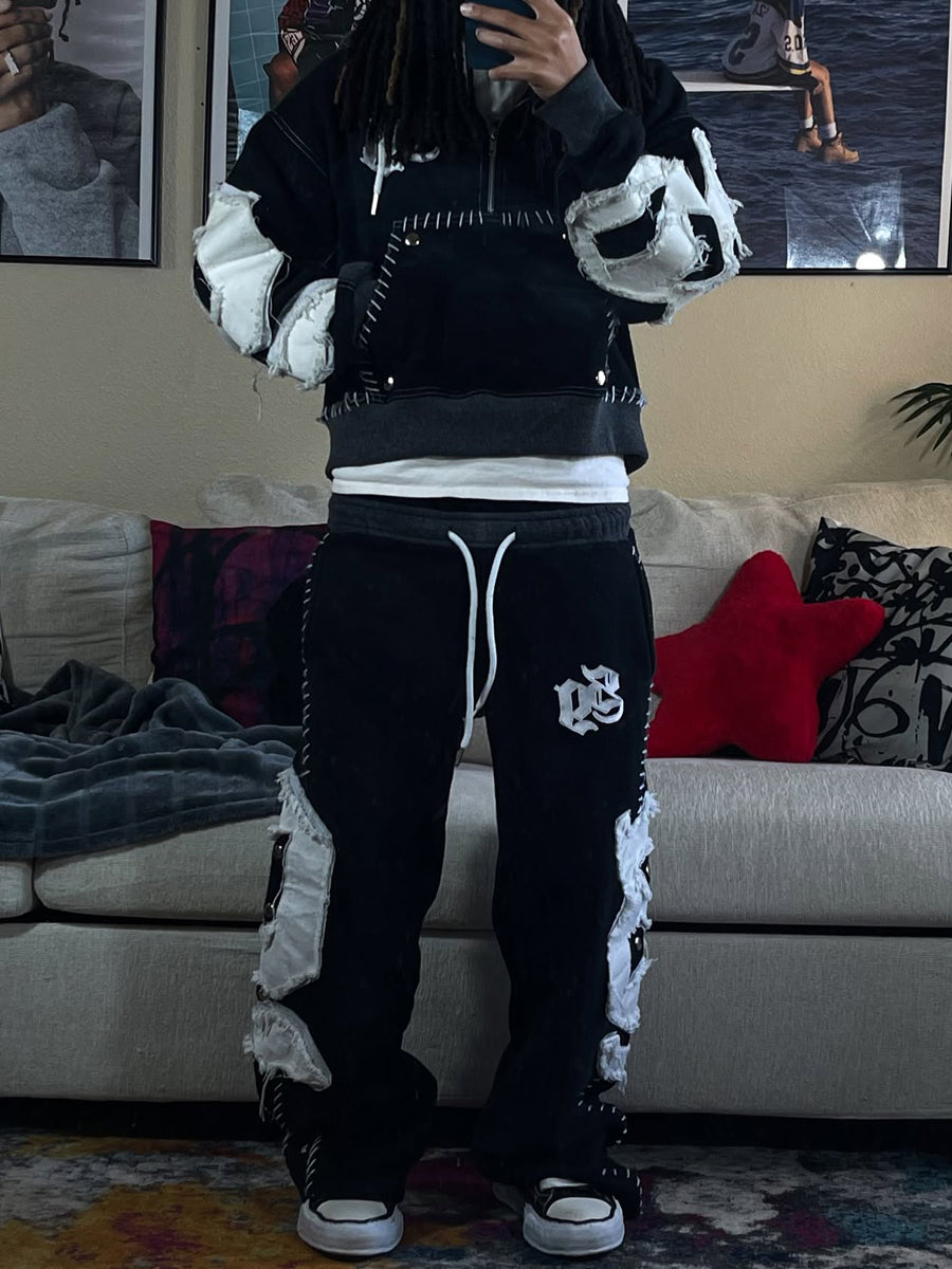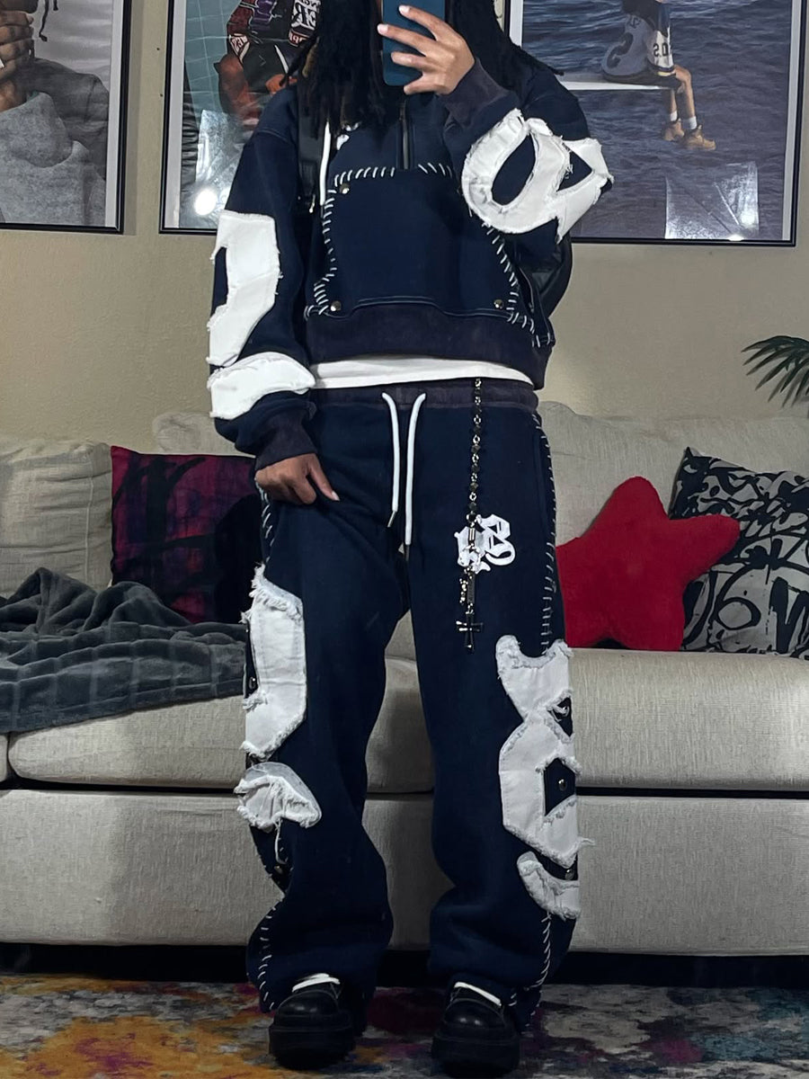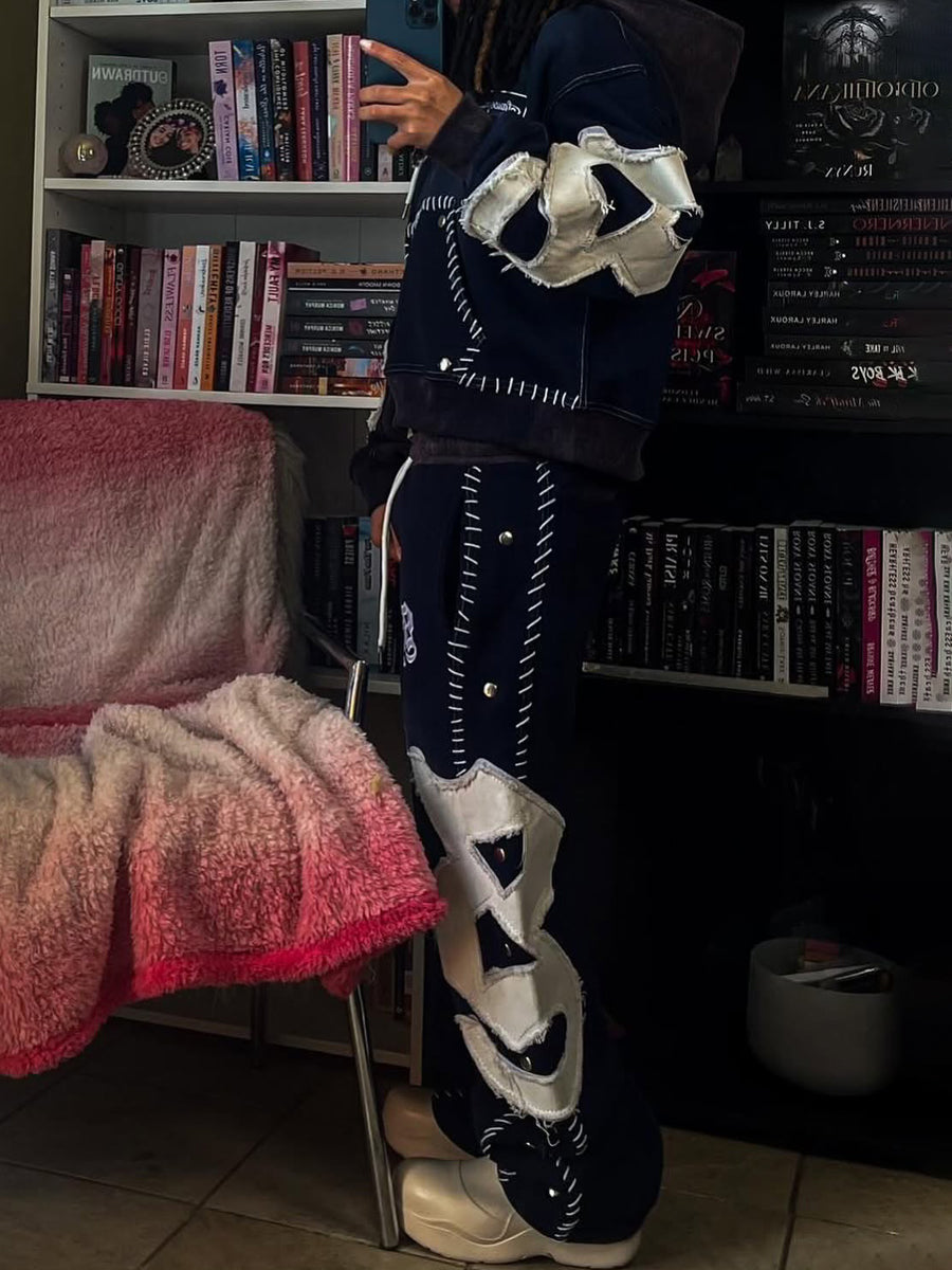 - Design: Features a cropped hoodie + wide-leg pants silhouette, with bold orange base and white distressed patch details. The relaxed fit and worn-in texture create a trendy, urban look.