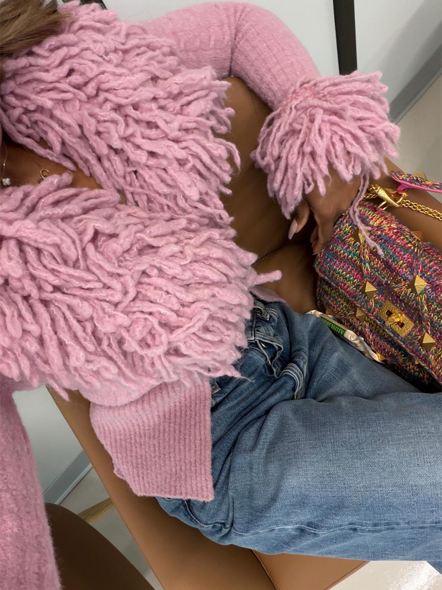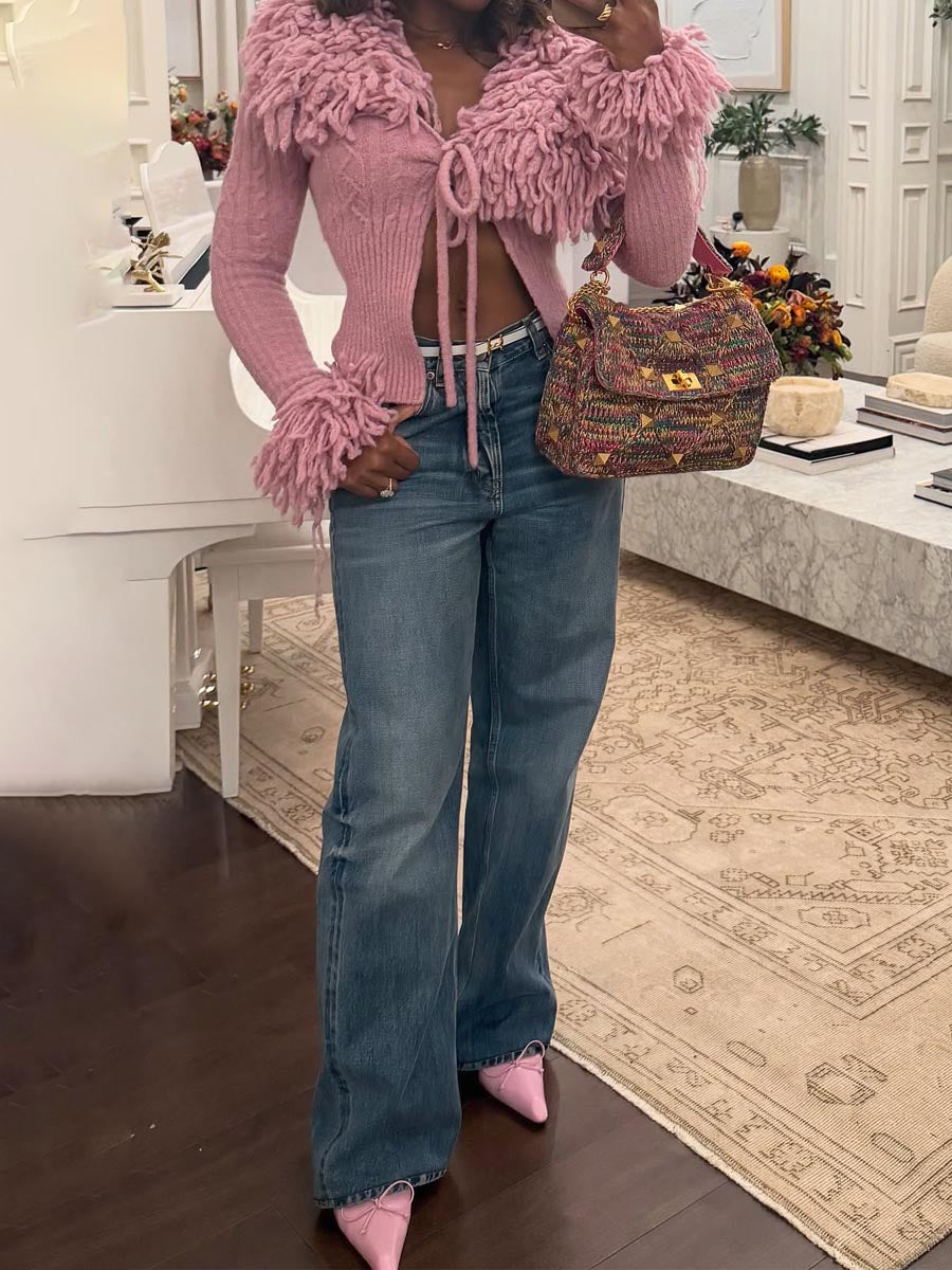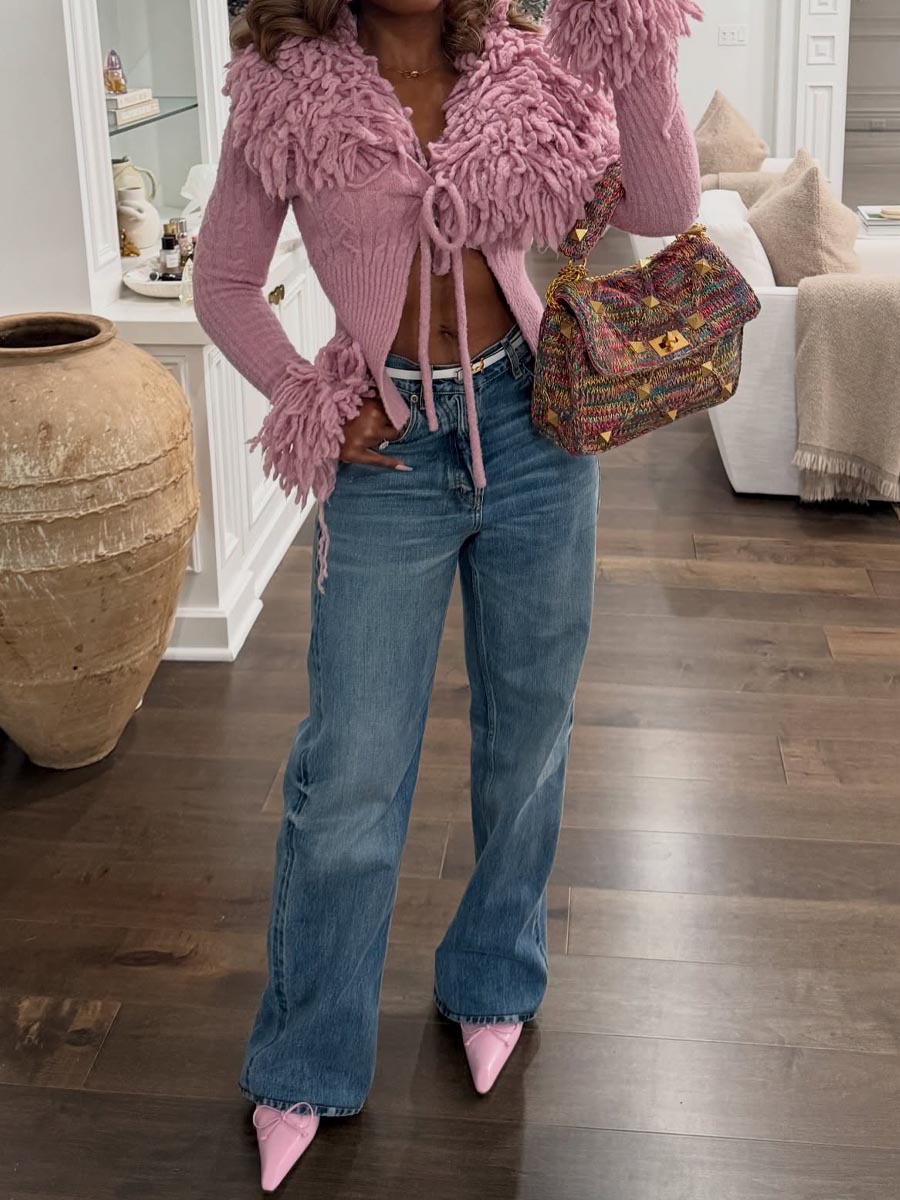 Pink cropped cardigan: Soft knit with fluffy trim + front drawstring. Slim fit, ideal for daily/casual styling.