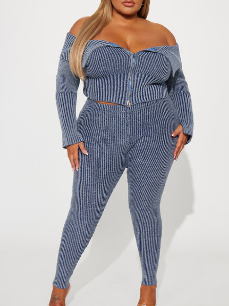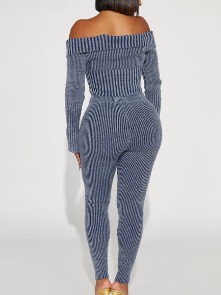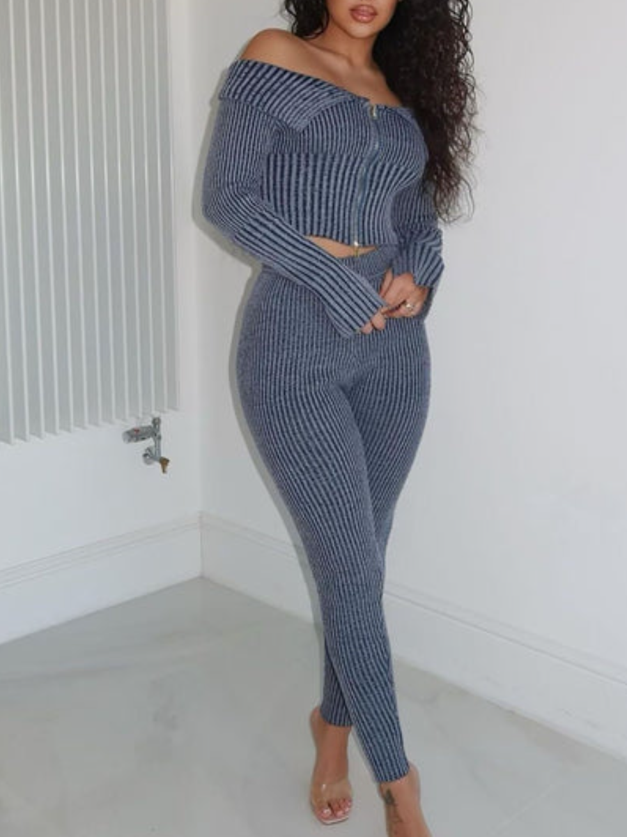 - Style: Chic off - the - shoulder ribbed two - piece set in a stylish blue hue.