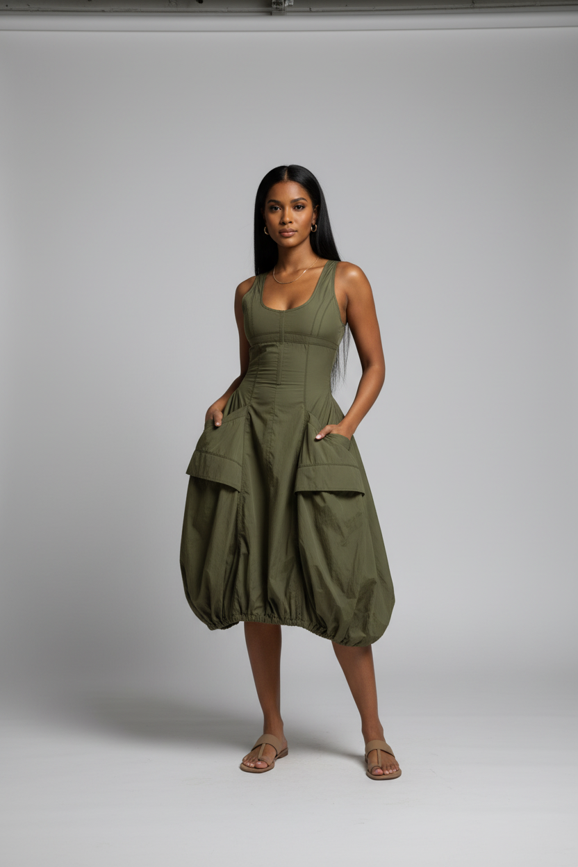 I just received this dress and I'm beyond thrilled! 😍 The quality is amazing, and the olive green color is even richer in person. What really stands out is the cut – it cinches at the waist beautifully, giving such a flattering silhouette, and then those unique balloon pockets? Genius! They add so much character without making it bulky. It's incredibly comfortable too, the fabric feels durable yet soft. I wore it out last night and got so many compliments. It's chic, unique, and perfect for making a statement without trying too hard. Highly recommend! You won't regret it.