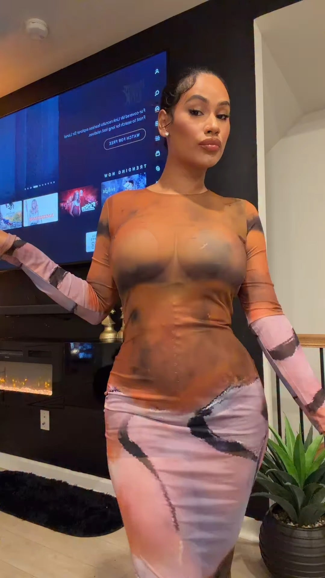 - Design: Round neck, long sleeves, orange-purple gradient print, bodycon maxi silhouette