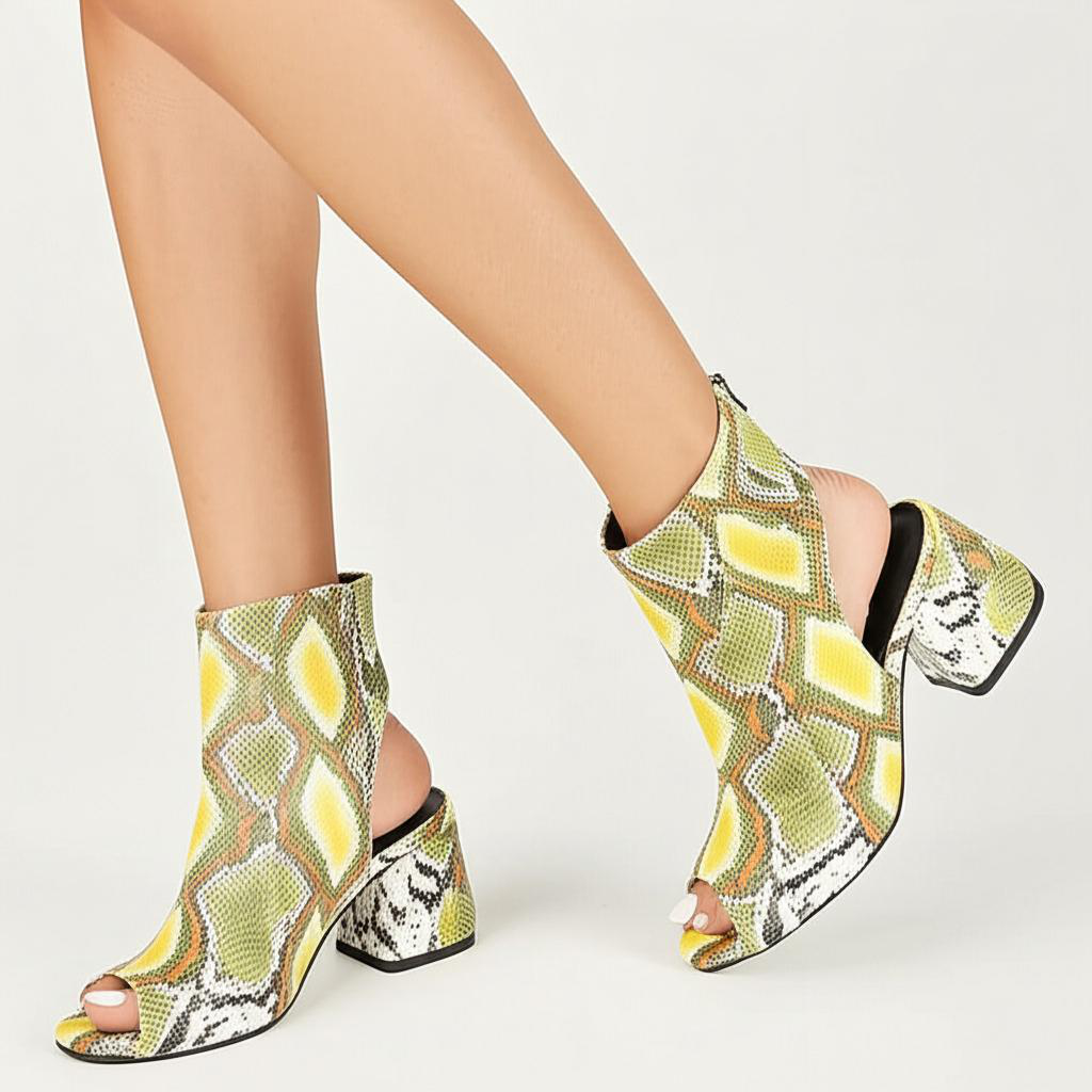 - Style:Ankle - high boots with a peep - toe design. Features a unique cut - out on the side and a textured pattern on the block heel.