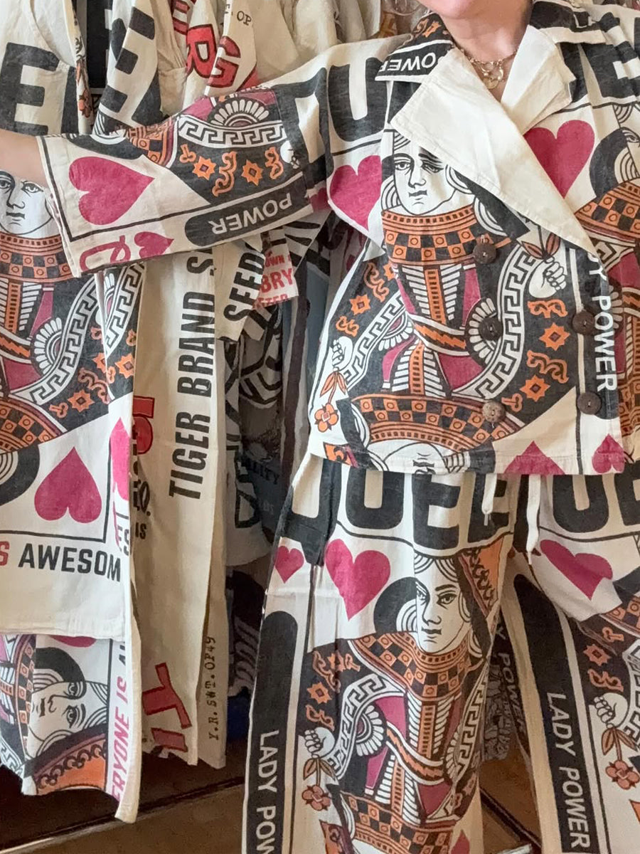 - Style: Playful and bold two - piece set featuring a vibrant playing card print with queen of hearts imagery and empowering text.