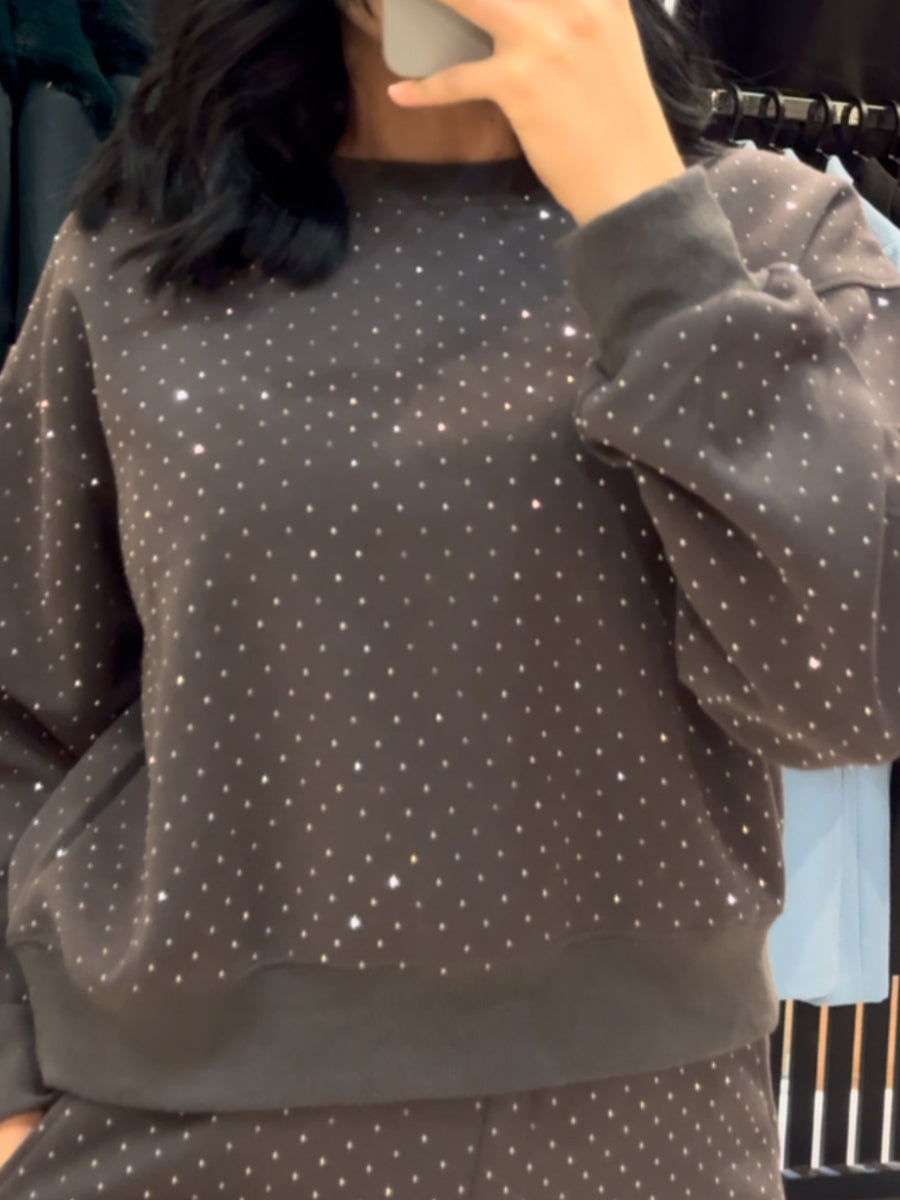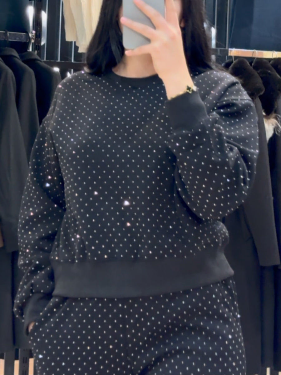 - Design: Features a relaxed-fit crewneck sweatshirt + wide-leg pants, both covered in subtle all-over sequins on a black base. The combination of loungewear silhouettes and shimmering details creates a versatile "dressy-casual" look.