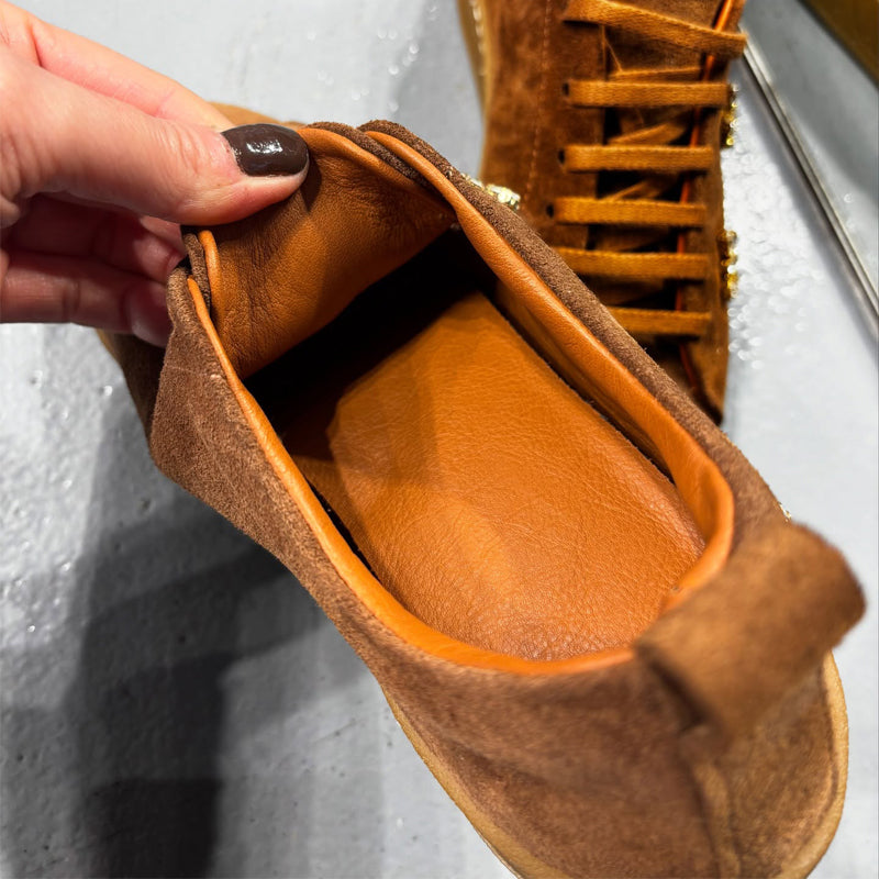 - Material:Suede upper, rhinestone flower embellishments, lace - up detail, durable sole.
