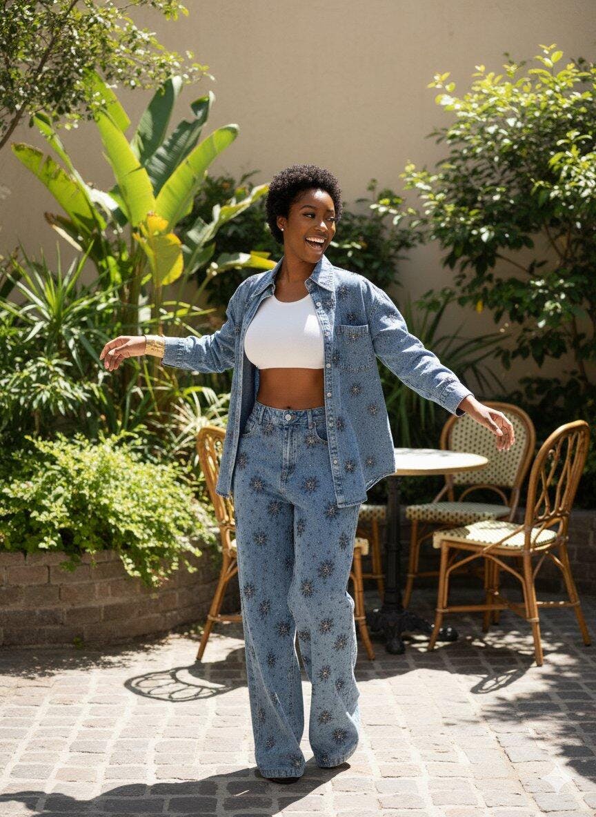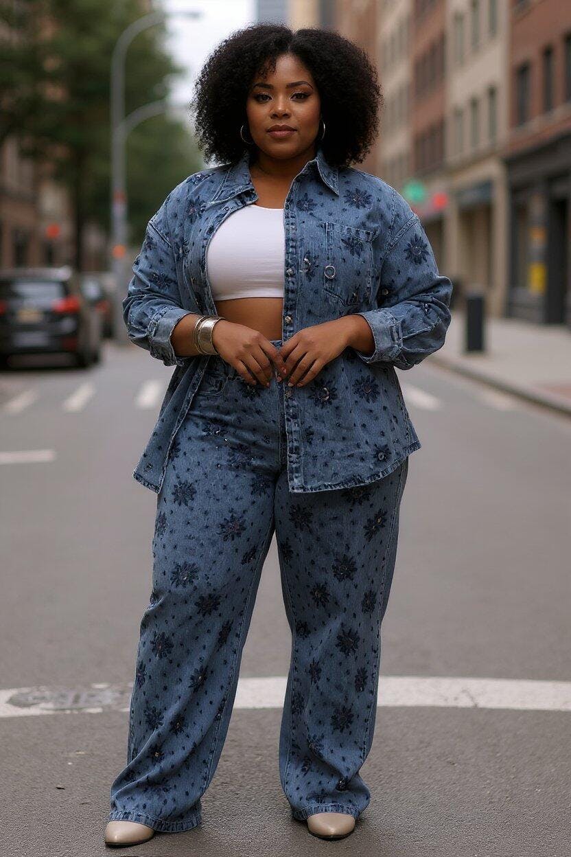 As a plus-size woman, I'm always a bit hesitant about embellished denim, but this set completely exceeded my expectations! The cut of both the shirt and the pants is incredibly flattering, giving enough room without looking baggy. The embellishments are placed perfectly and draw attention in all the right ways. I felt confident and stylish, which is a huge win for me. It's so hard to find fashionable pieces that truly work for curvier figures, but this one is a gem!