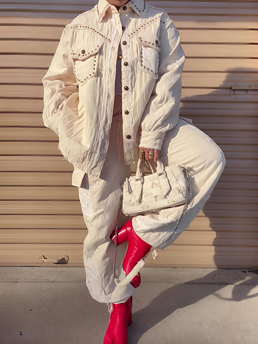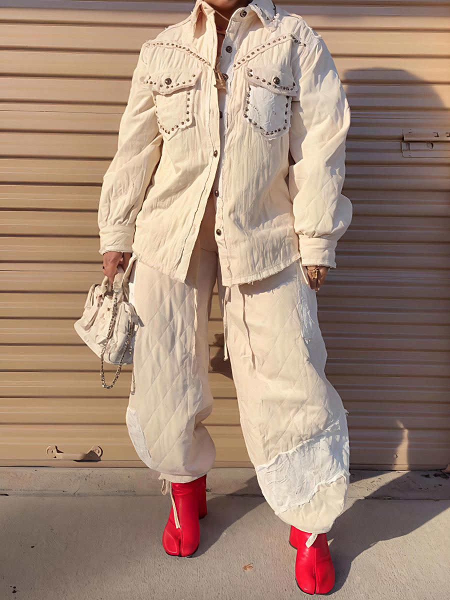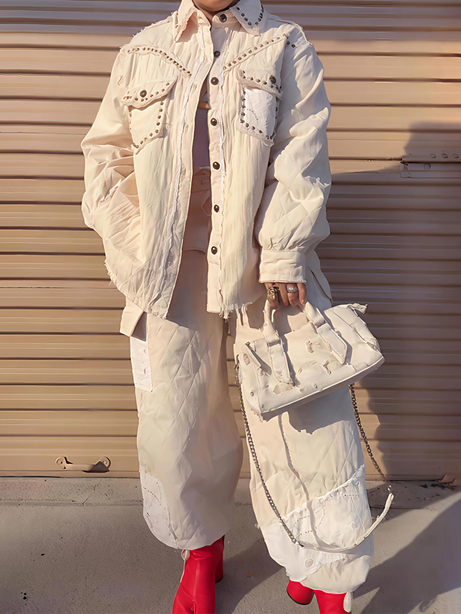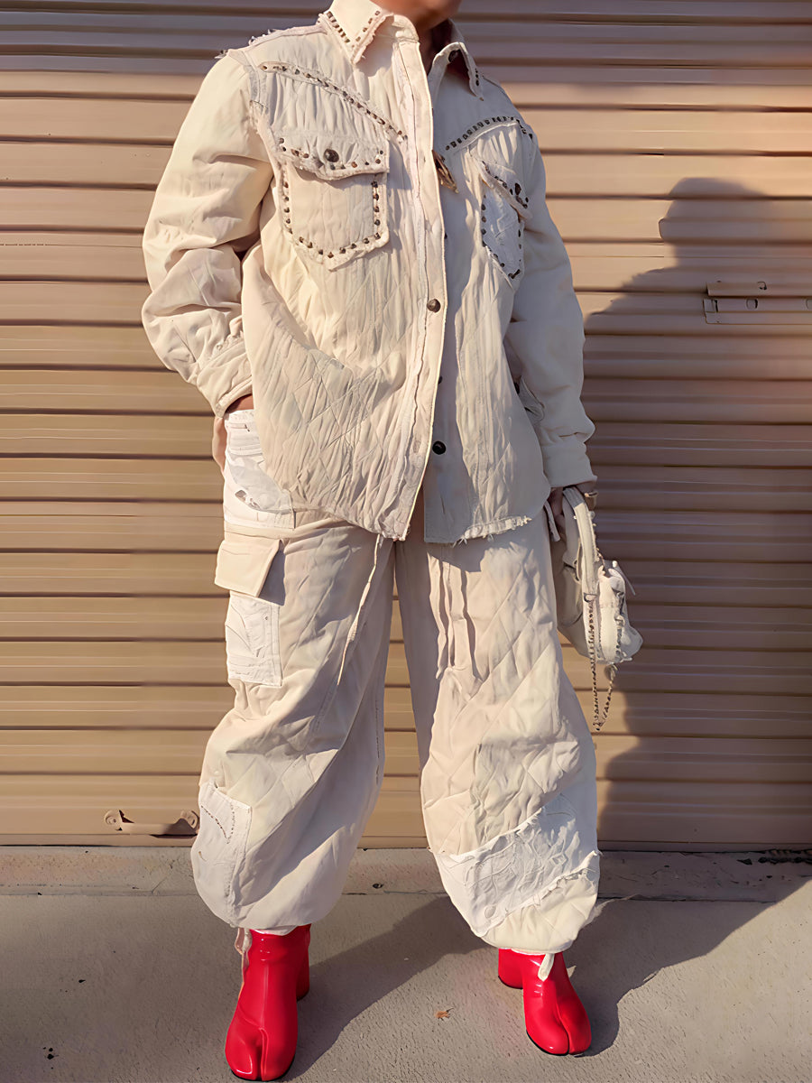 - Design:Features a quilted jacket with studded pocket details and matching quilted pants with textured patches. The neutral beige tone and oversized silhouette create a versatile, edgy look.