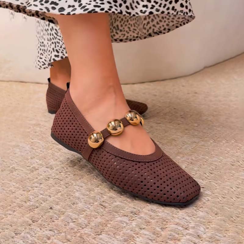 - Style: Classic ballerina flats featuring perforated design for breathability and metal accents on the strap. The square - toe shape adds a modern touch.