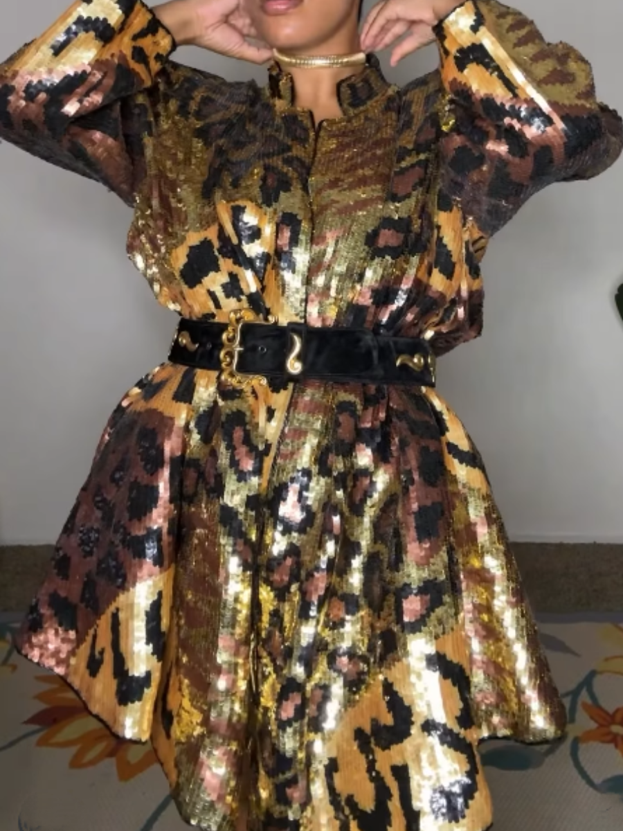 - Design Elements: All - over leopard print in shimmering sequins, structured shoulders, and a wide black belt to cinch the waist for definition.