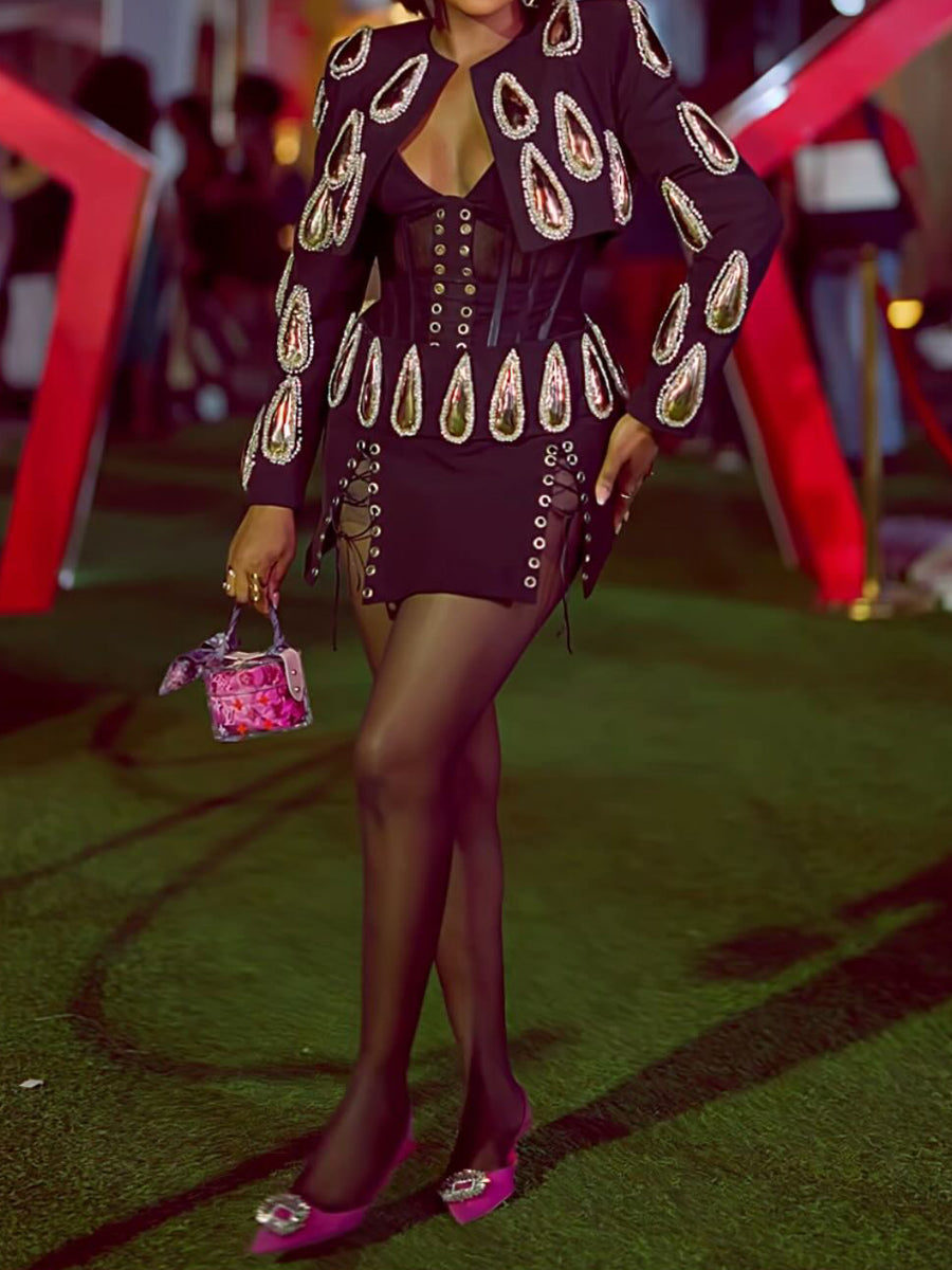 - Design: Body-con mini with corset lacing, cutout detail, and bold embroidered embellishments — edgy-glam statement vibe.
