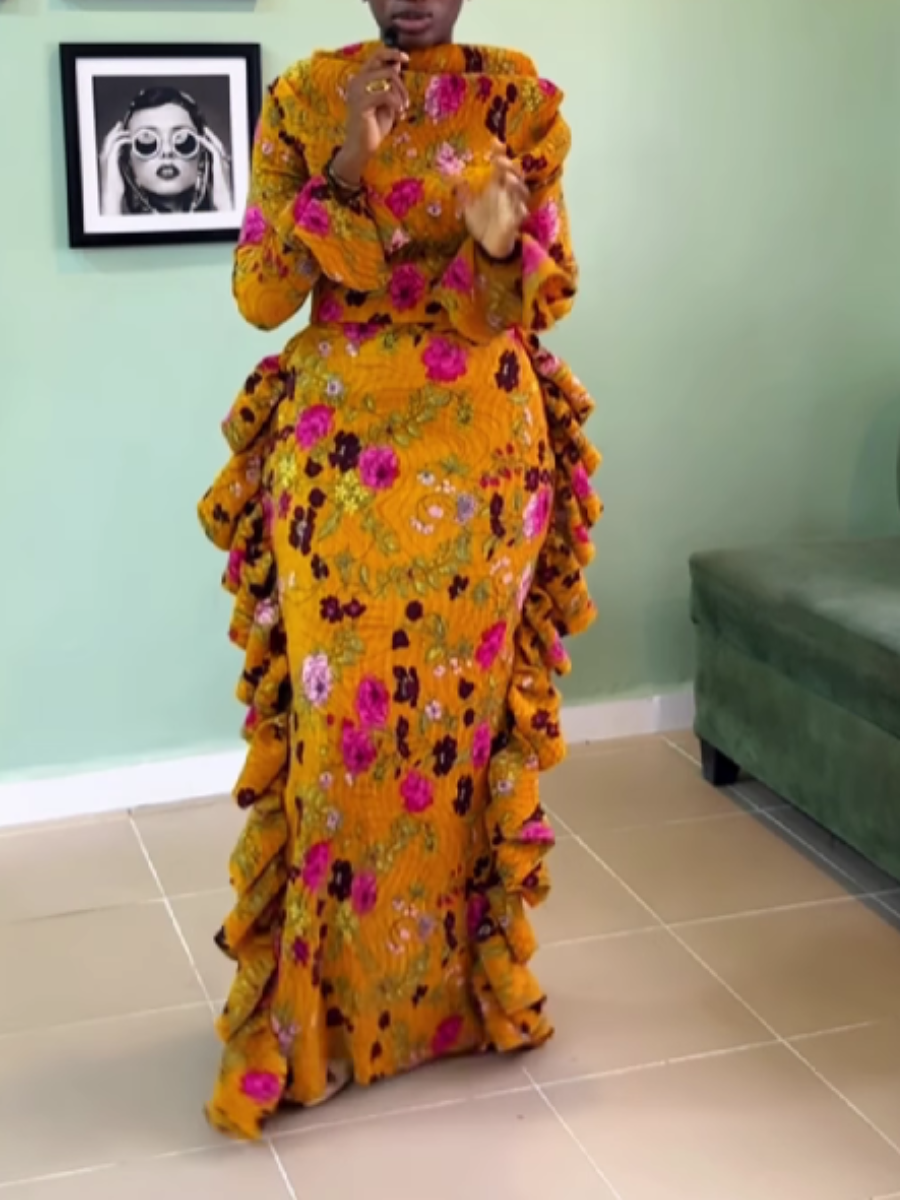 - Style: Mustard Yellow Floral Ruffled Maxi Dress, blending vibrant bohemian charm and dramatic femininity.