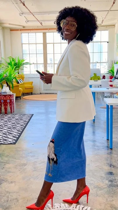 - Design: Notched lapel blazer; blue crane print slim midi skirt